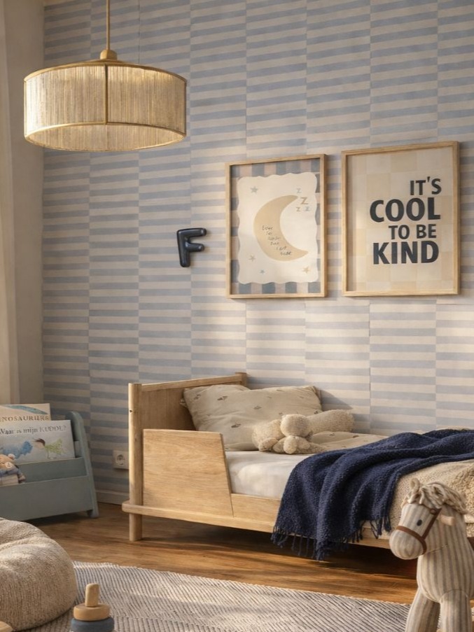 Met het Cheeky Check behang in Denim Sky als basis en de posters “Love you to the moon and back” en “It’s cool to be kind” als eyecatchers creëer je een kinderkamer die stoer, rustig en tijdloos is. Een ruimte die meegroeit met je kind en waar sfeer en speelsheid perfect in balans zijn.
