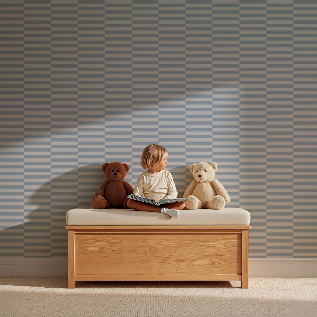 Het kleurenpalet van deze kinderkamer draait om denimblauw, zacht grijsblauw en warme neutrale tinten zoals beige en off-white. Deze combinatie zorgt voor een rustige basis waarin het Cheeky Check behang in Denim Sky perfect tot zijn recht komt. Door natuurlijke materialen toe te voegen, zoals hout, rotan en zachte stoffen, krijgt de kamer extra warmte. Donkerdere accenten in blauw of antraciet zorgen voor een stoere touch, zonder dat de ruimte zwaar aanvoelt. Een tijdloos palet dat makkelijk meegroeit met je kind.