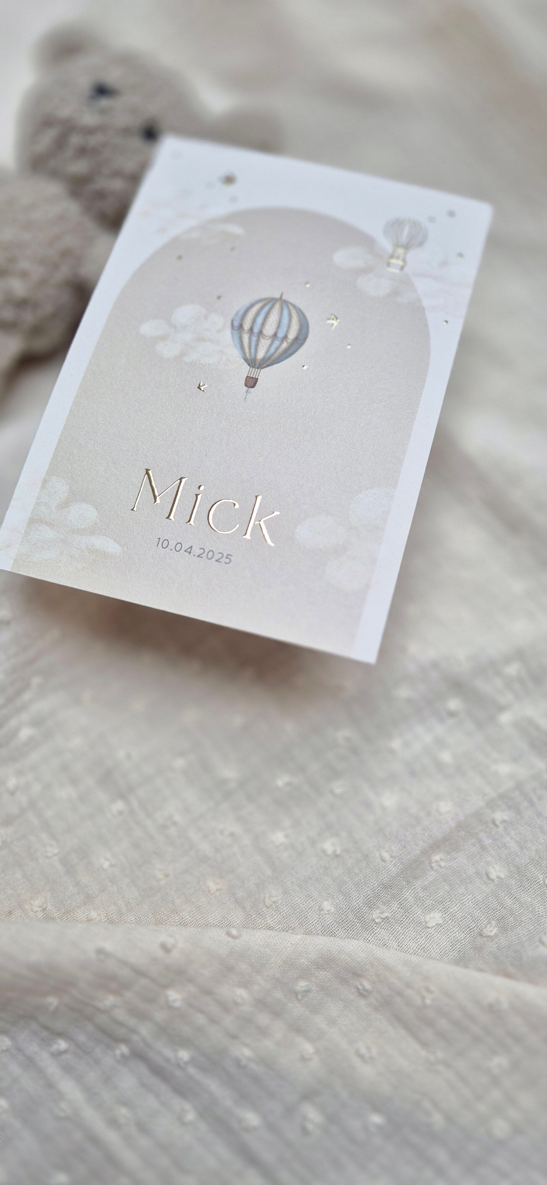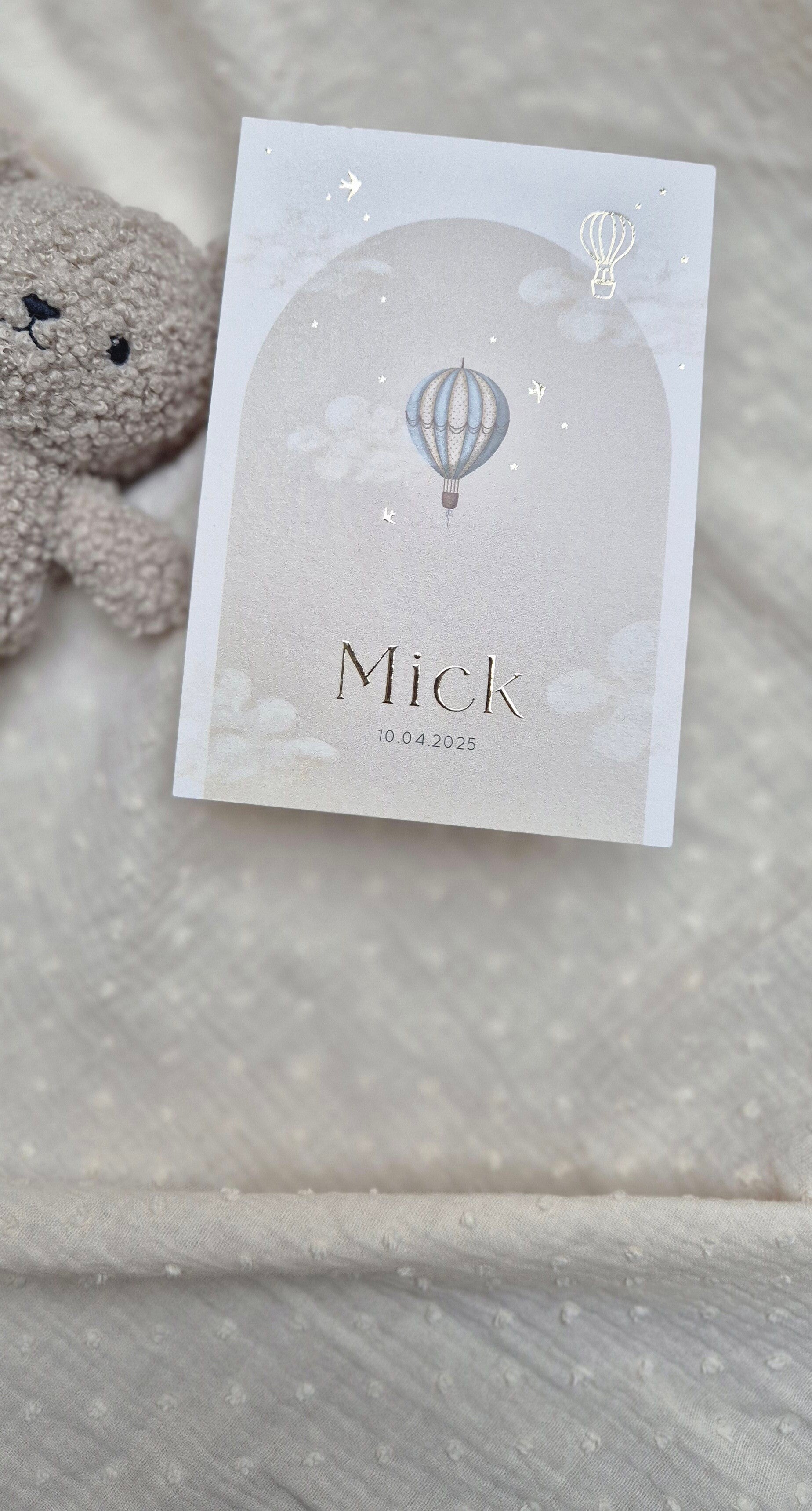Een zacht en dromerig geboortekaartje met een illustratie van een luchtballon tussen wolkjes en kleine sterren. De naam in goudfolie geeft een verfijnde glans, terwijl de rustige kleuren en het ronde kader een lieve en serene uitstraling creëren. Perfect voor een warm en stijlvol welkom.