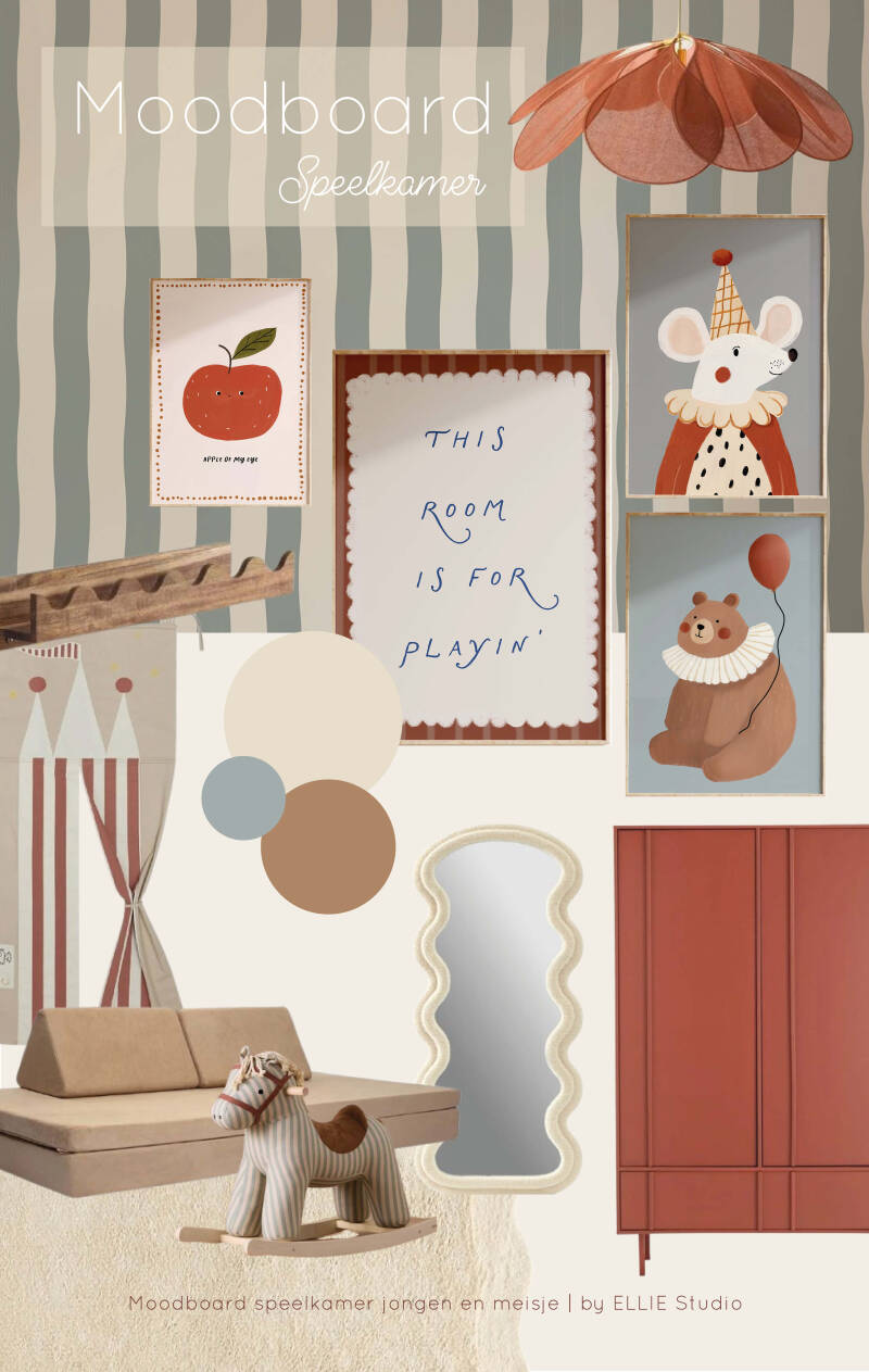 Een plek waar fantasie tot leven komt en kinderen vrij kunnen spelen, ontdekken en groeien. Dit moodboard is speciaal samengesteld als inspiratie voor een genderneutrale speelkamer, perfect voor zowel jongens als meisjes.
