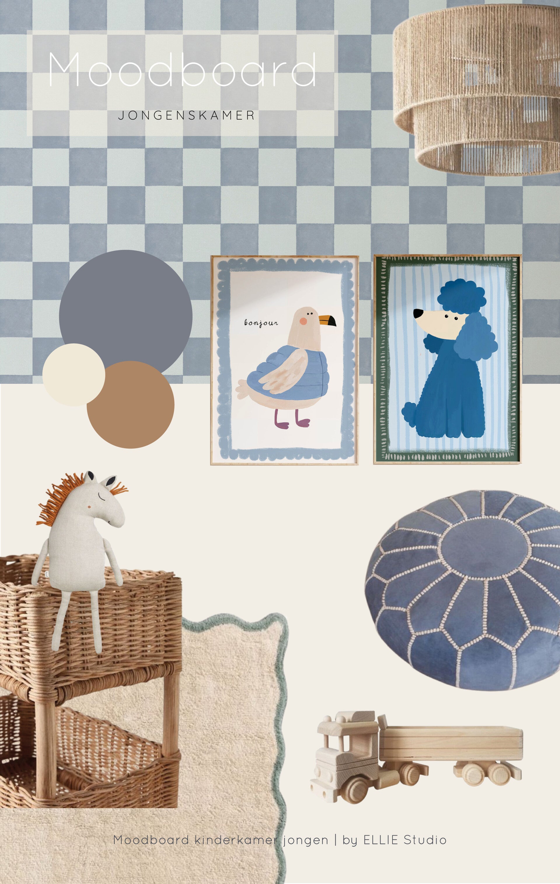 Verder zie je in het moodboard onze favoriete accessoires terug: een zachte poef om op te hangen of boekjes te lezen, een schattig knuffelpaard dat klaar is voor elk avontuur, én natuurlijk een houten vrachtwagen voor urenlang speelplezier.
