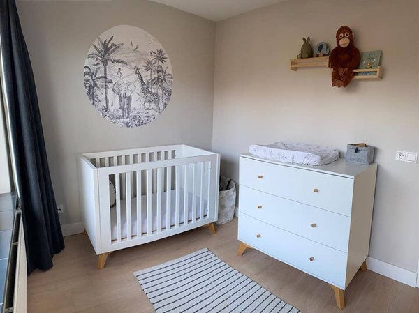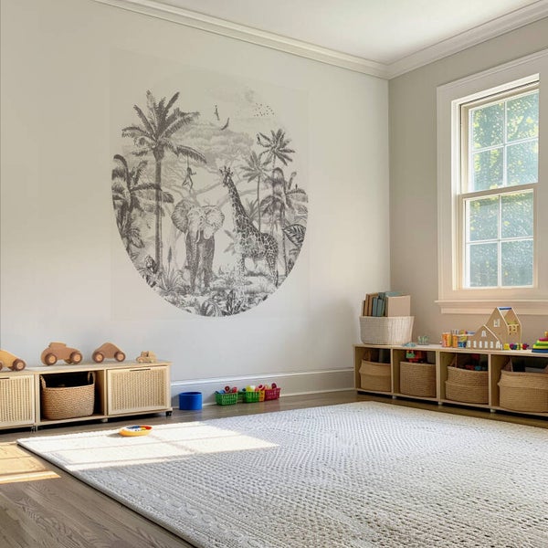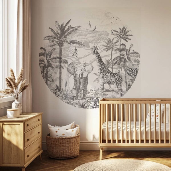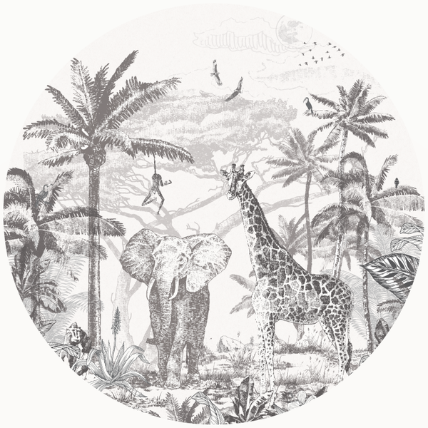 Deze waanzinnige behangcirkel maakt van iedere kamer een jungle paradijs. Op deze prachtige zelfklevende sticker vind je een giraffe, een olifant, vogels en verschillende aapjes die zich verstoppen tussen de prachtige palmbomen en tropische planten.