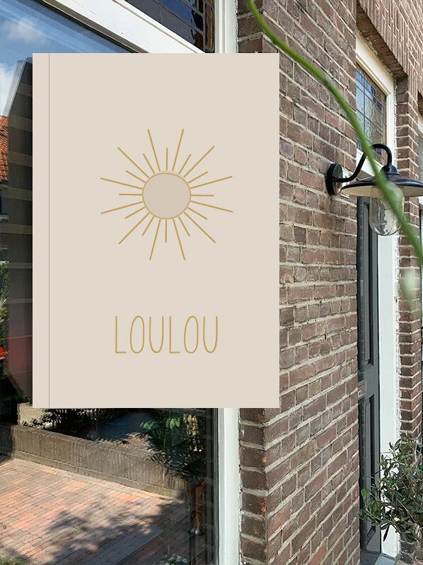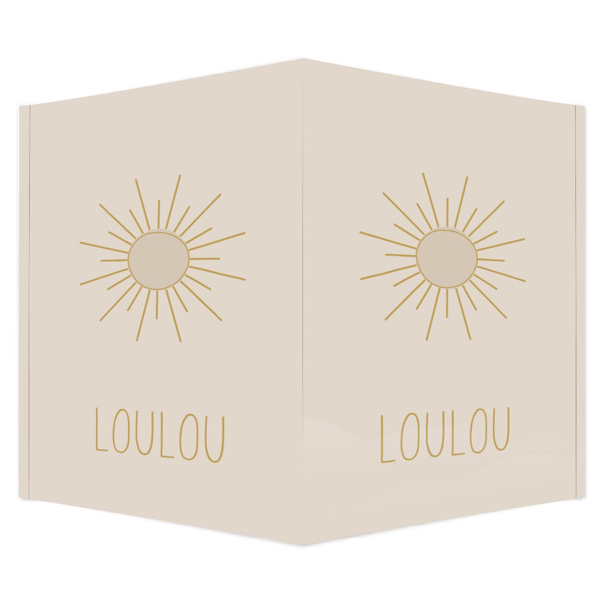 Het geboortebord heeft een warm beige ondergrond en weergeeft een zon in een goudgele kleur.