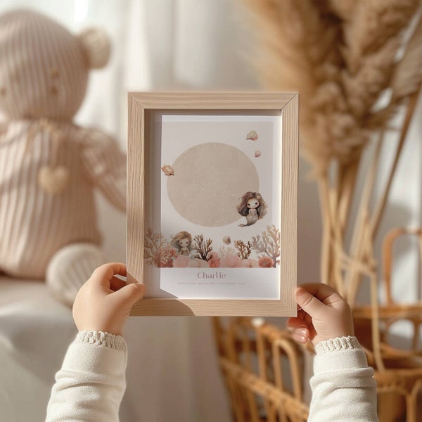De poster heeft een licht zandkleurige achtergrond en prachtige illustraties in warme koraalkleuren. Op de poster zie je 2 schattige zeemeerminnen omringt door prachtige scheplpjes en koralen.
