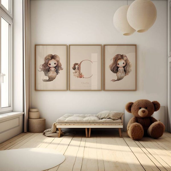 Deze kinderkamer poster met zeemeermin in zachte beige tinten brengt een rustige en dromerige onderwater sfeer in de babykamer of kinderkamer. De illustratie toont een lieve zeemeermin met een schelpstaart en vloeiend haar, afgebeeld op een warme neutrale achtergrond. De zachte kleuren en verfijnde details zorgen voor een tijdloze uitstraling die perfect past binnen een rustig interieur.