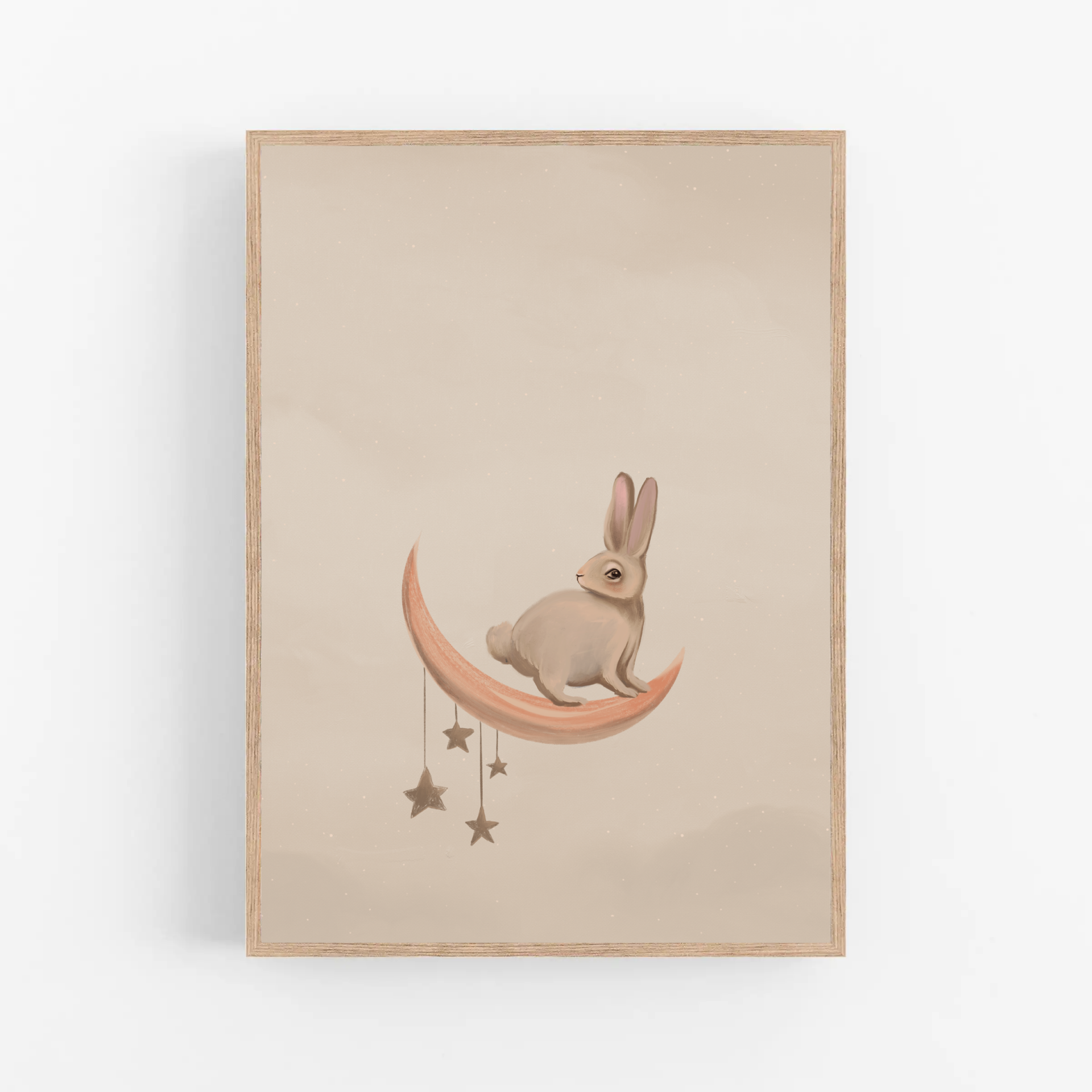 Deze poster weergeeft een nachtelijk tafereel met een konijntje zittend op een prachtige maan ☾.