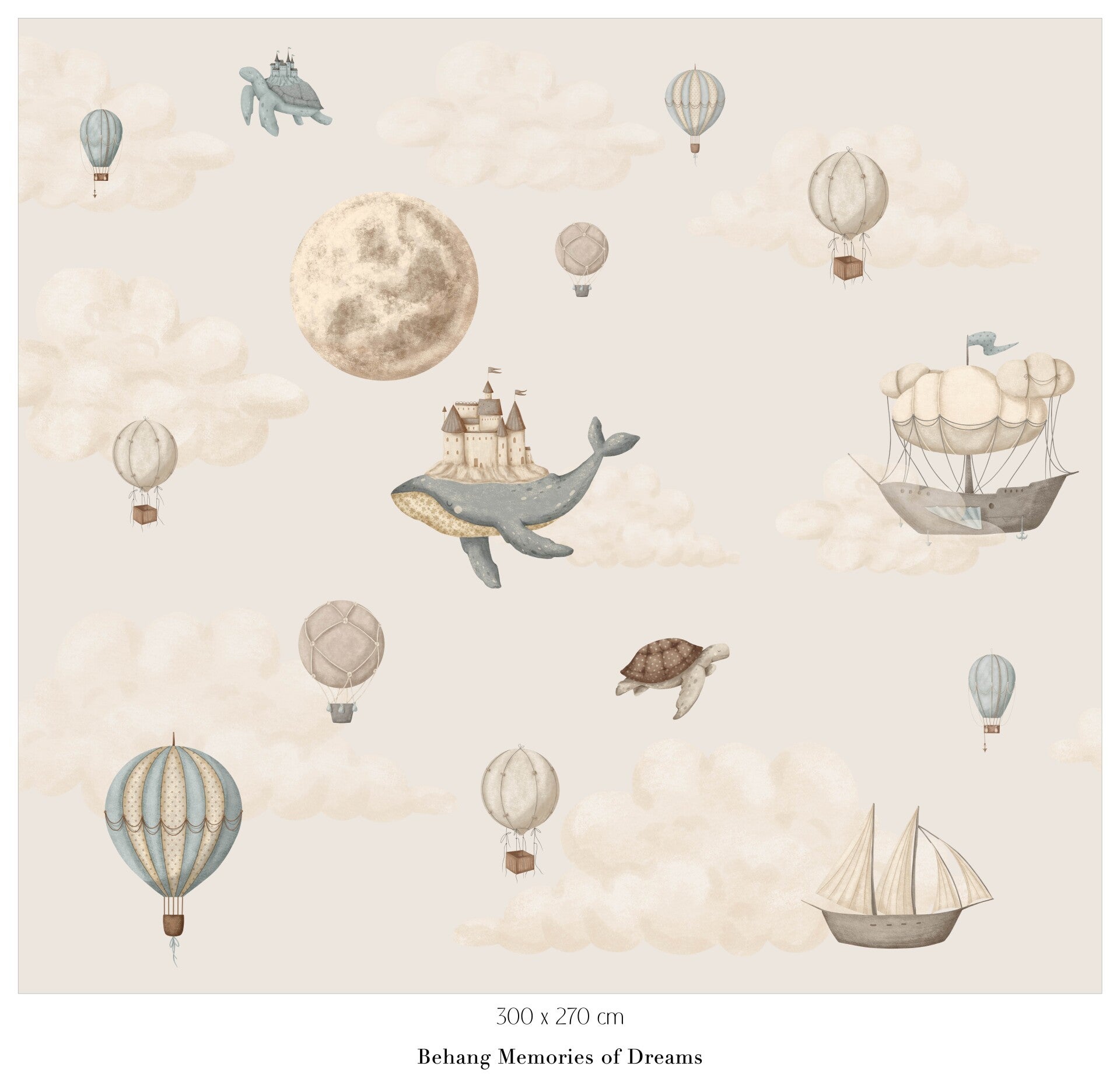 Breng de fantasie van de zee naar de kamer van je kleintje met het superleuke fotoprint behang "Memories of Dreams"! Dit behang staat vol met schattige zeedieren zoals walvissen, schildpadden en roggen die vrolijk tussen de wolken zwemmen. En wat dacht je van de piratenschipjes en kastelen? Ideaal voor avontuurlijke speeluren!