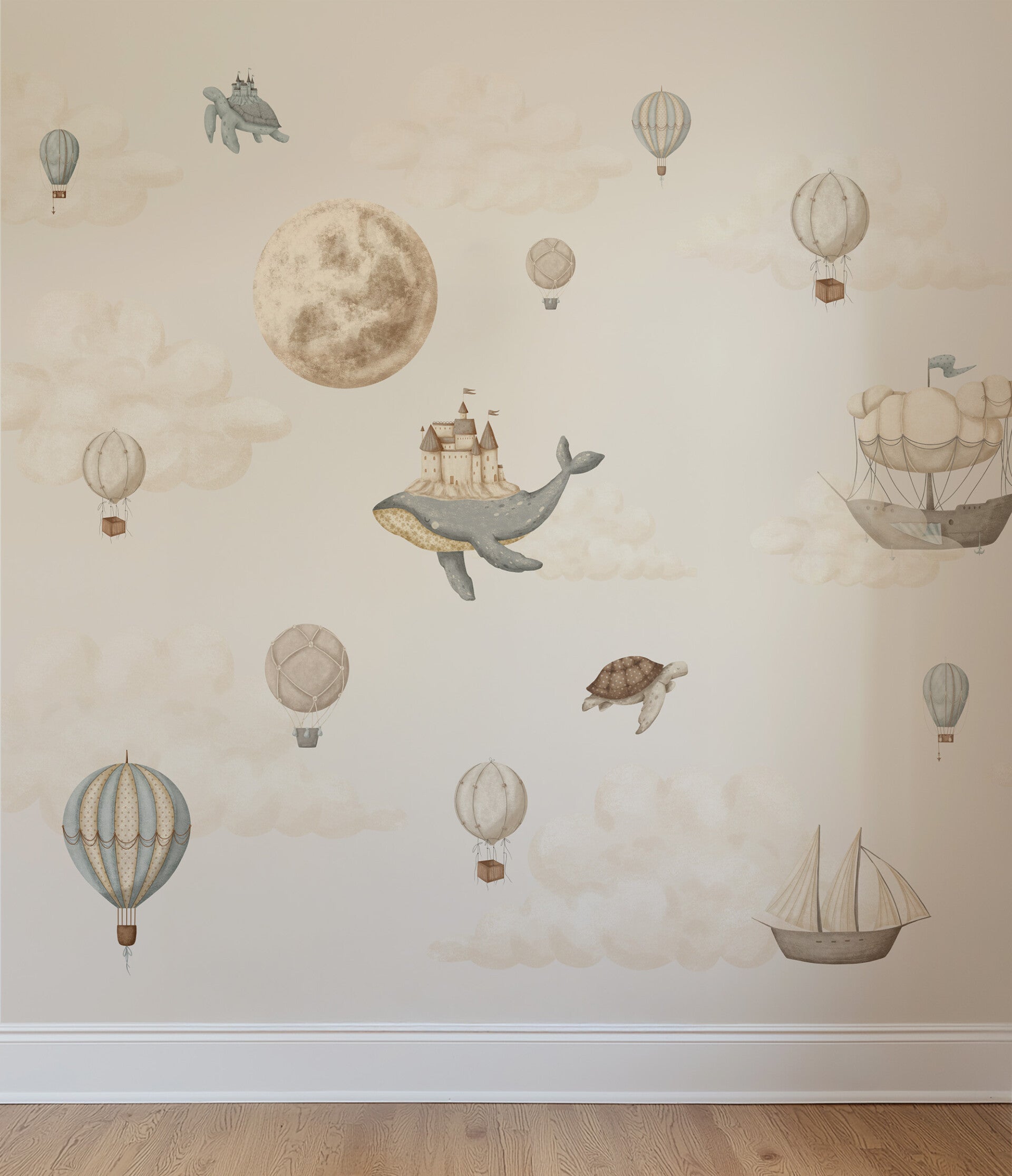 Met een warme beige achtergrond en mooie kleuren in bruin, zand, beige, grijs en blauw creëert dit behang een gezellige sfeer. Perfect voor babykamers en kinderkamers! Laat je kinderen wegdromen in hun eigen magische wereld vol plezier en avontuur. Dit behang is niet alleen een blikvanger, maar ook een uitnodiging tot eindeloze fantasie. Maak hun kamer tot een plek vol dromen en ontdekkingen!