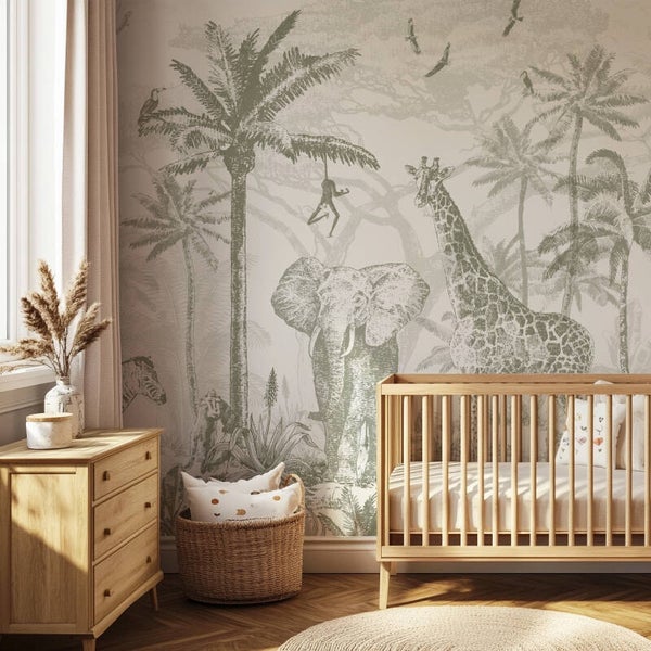 Dit behang zit vol met jungle dieren en planten. Denk aan een giraf, een imposante olifant, een stoere neushoorn, sierlijke zebra en grappige aapjes die in palmbomen klimmen. En niet te vergeten, prachtige vogels die voor extra vrolijkheid zorgen.