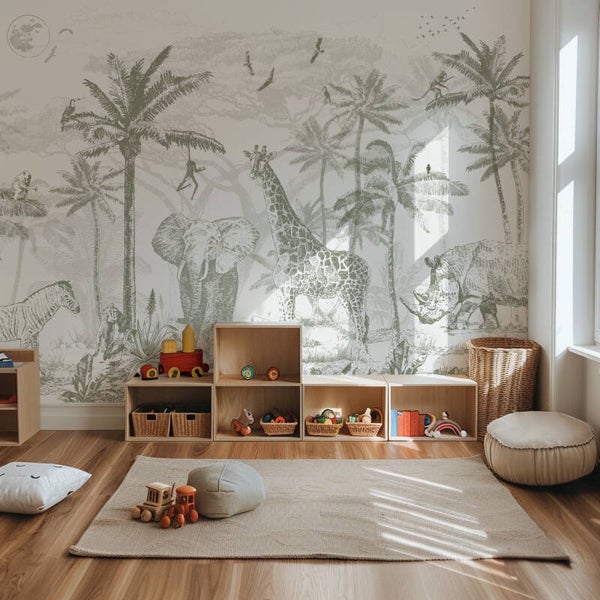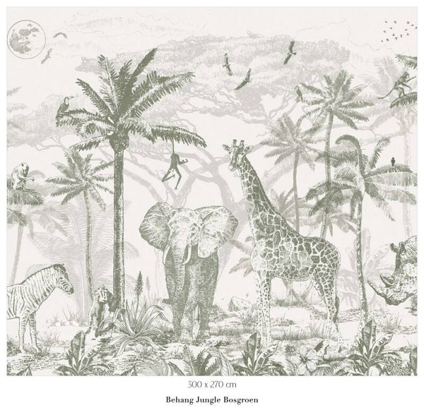 Breng een vleugje exotische wildernis in de kamer van je kleintje met ons geweldige fotoprint behang met jungle thema. Dit behang combineert toffe grafische illustraties met frisse, speelse bosgroene tinten, perfect voor baby- en kinderkamers.