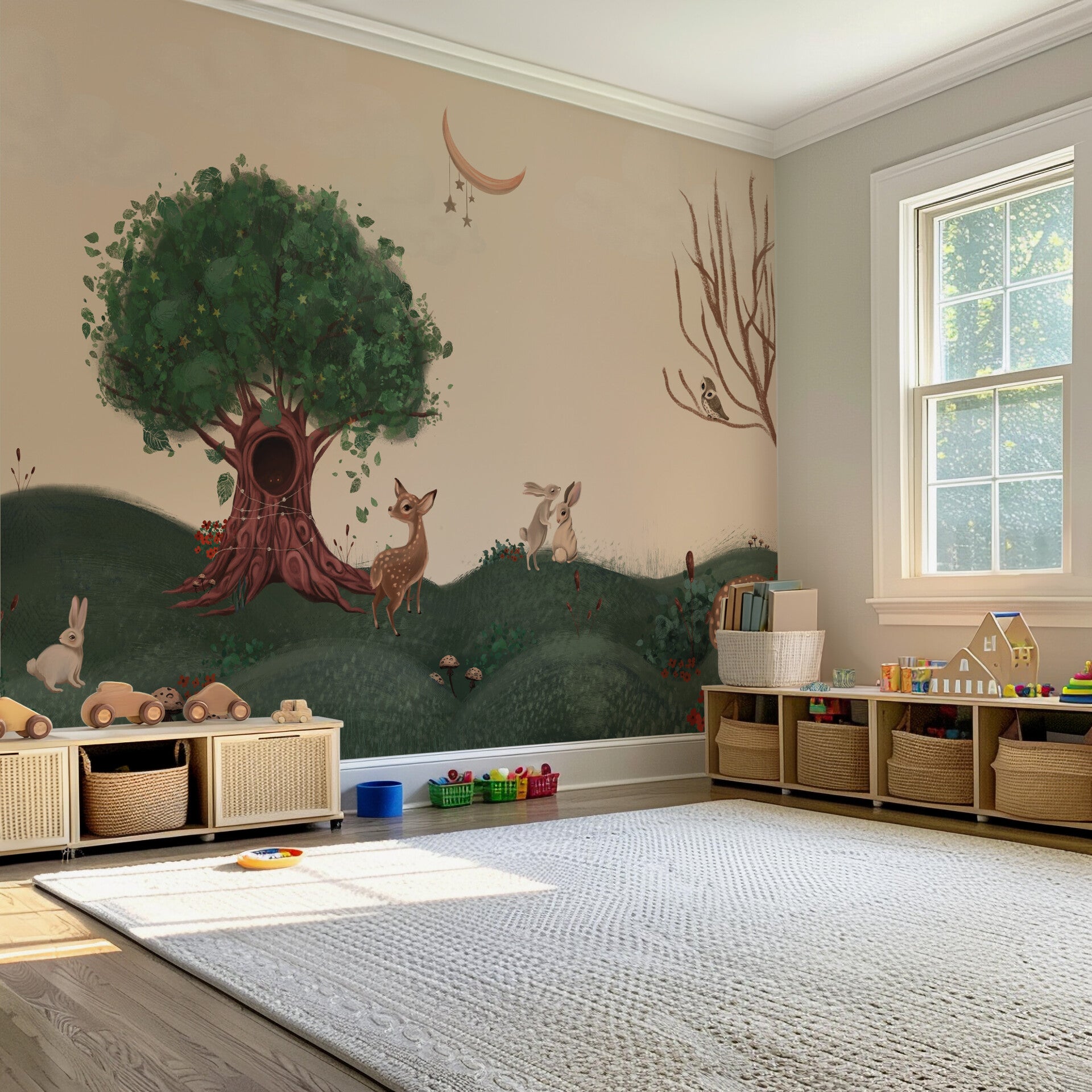 Breng magie in de kamer van je kleintje met ons Enchanted Forest behang! Dit betoverende ontwerp toont schattige bosdieren die avonturen beleven in een mystiek bos, onder een prachtige sterrenhemel en een stralende maan. Perfect voor zowel babykamers als kinderkamers, dit behang nodigt je kleintje uit om te dromen en de natuur te verkennen.