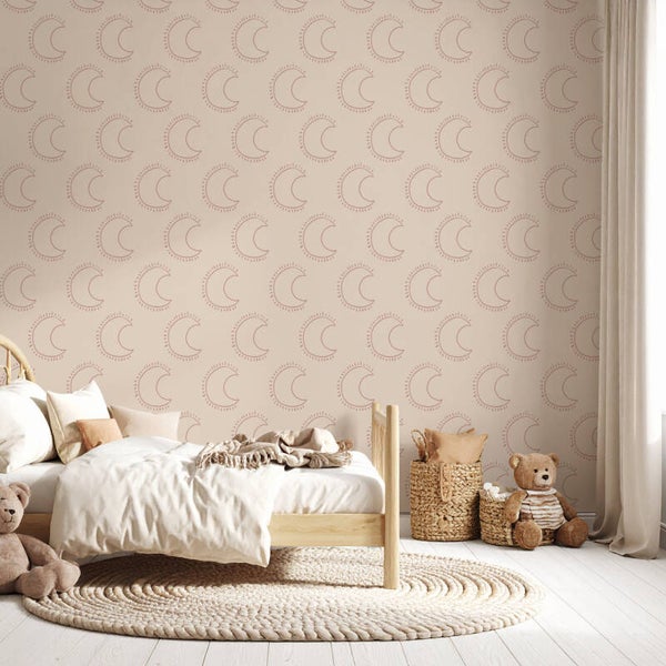 De ondergrond heeft een zachte beige kleur, met daarop lieve oudroze maantjes die een speels en rustig sfeertje geven. Perfect voor kleine dromertjes die houden van een knusse plek om te slapen, spelen en nieuwe avonturen te bedenken!