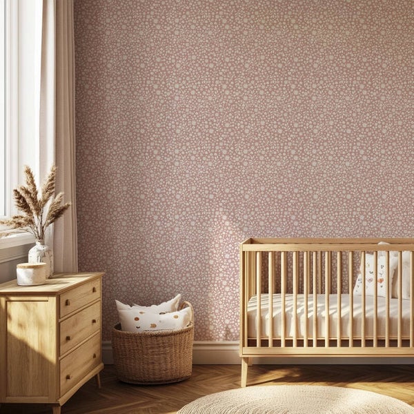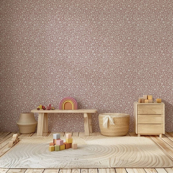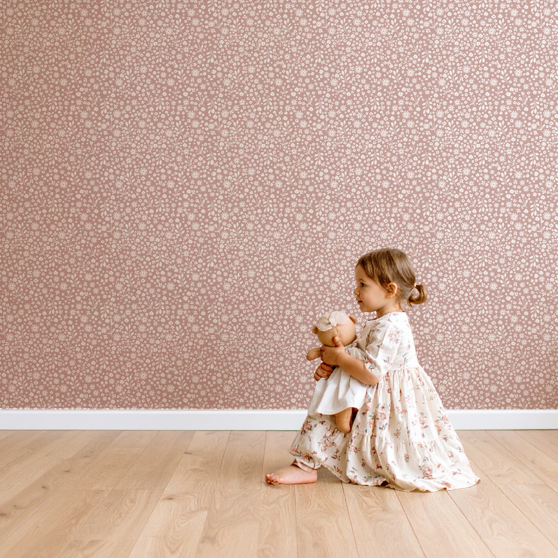 Dit supergezellige bloemenbehang maakt de baby- of kinderkamer helemaal af! De ondergrond heeft een zachte, oudroze tint, en daarop staan kleine witte bloemetjes verspreid. Perfect voor een fijne, rustige sfeer waarin je kleintje heerlijk kan spelen en slapen.