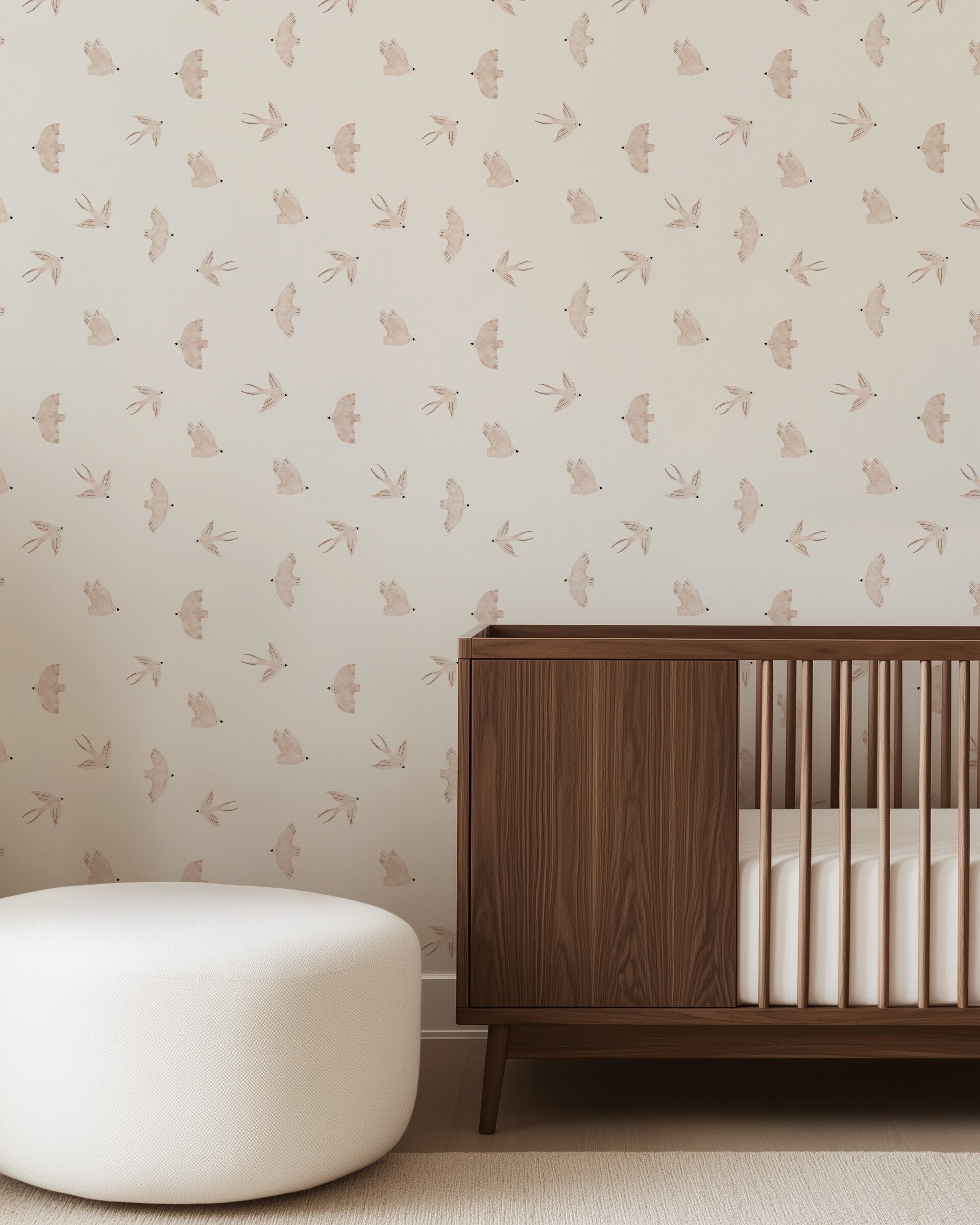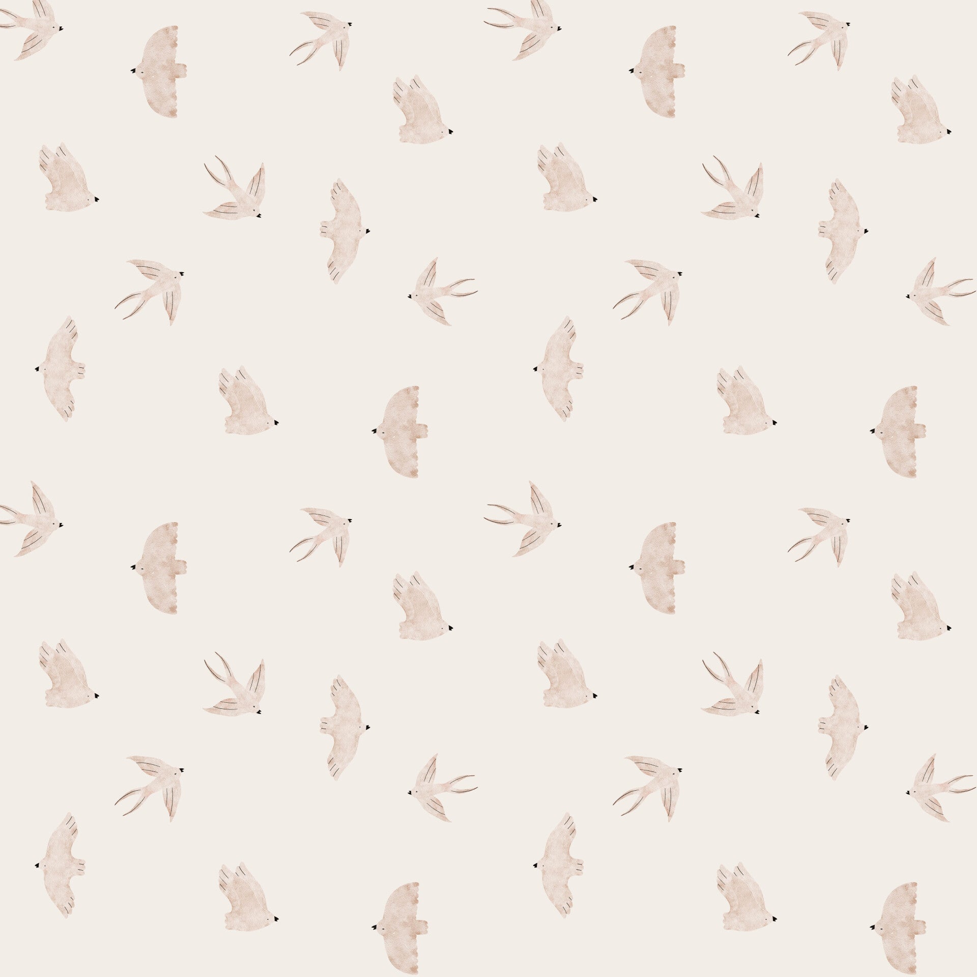Dit superleuke patroonbehang voor de baby- en kinderkamer heeft een fijne beige ondergrond met schattige zwaluwen in een donkerder beige tint.