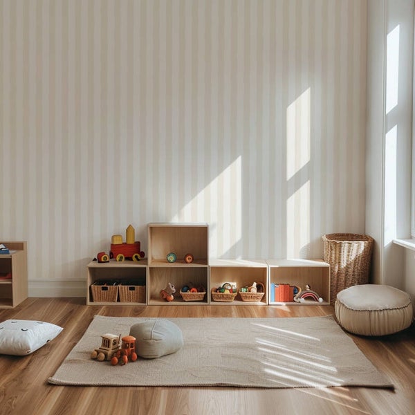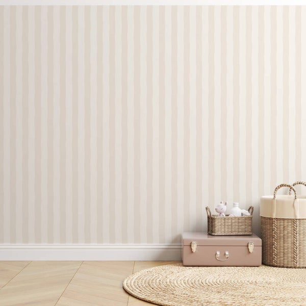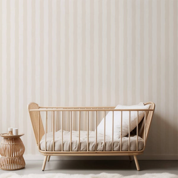 Dit schattige behang voor de baby- en kinderkamer is een prachtig strepen behang met lichte wave.