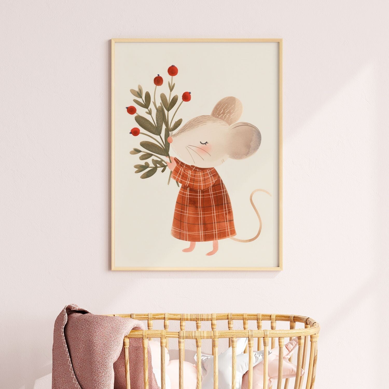 Een prachtige poster met illustratie van een muisje met jurk, met een bosje bloemen in haar pootjes.