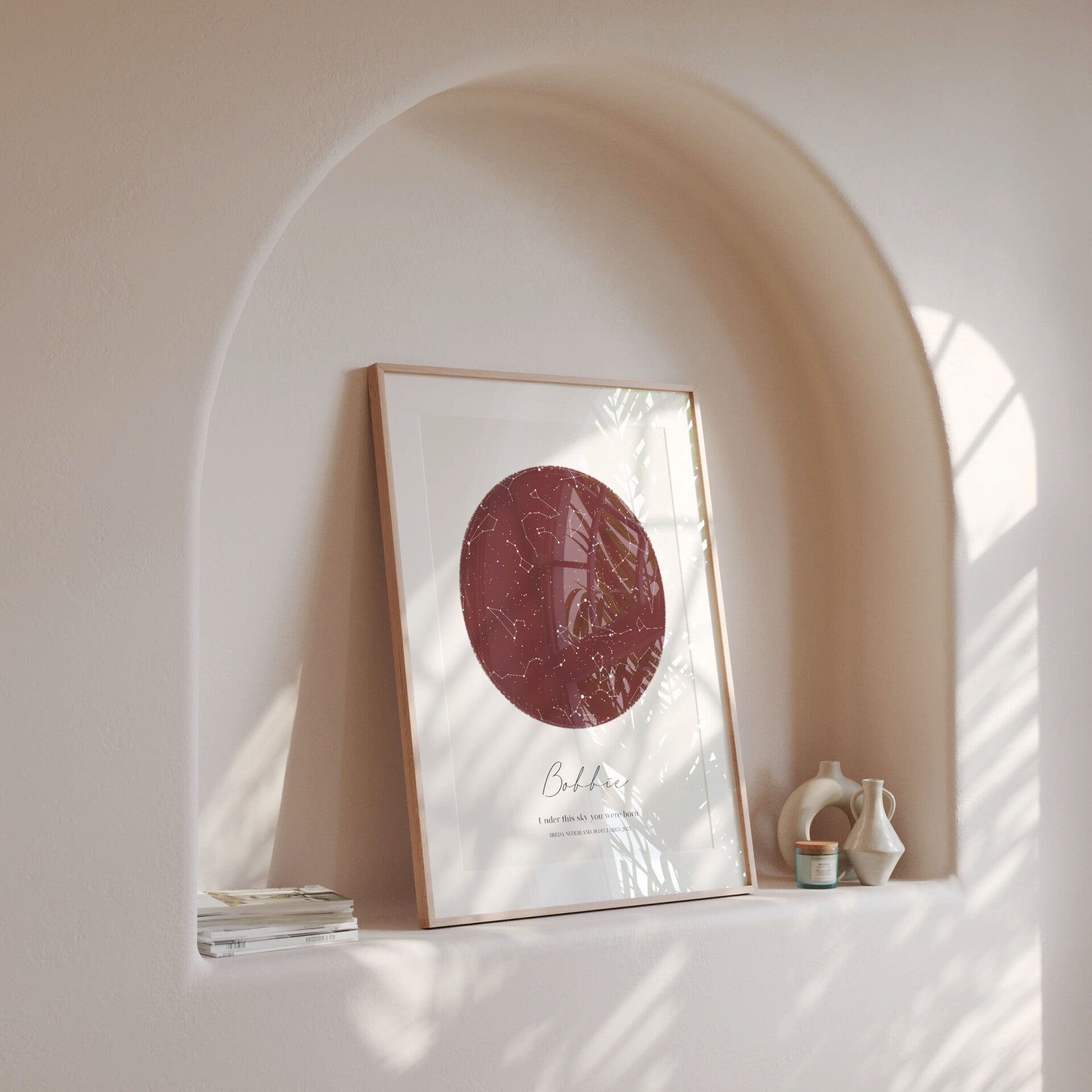 Deze sterrenstand poster heeft een prachtige bordeaux rode cirkel met watercolor effect, de sterrenhemel wordt gedrukt in het wit.
