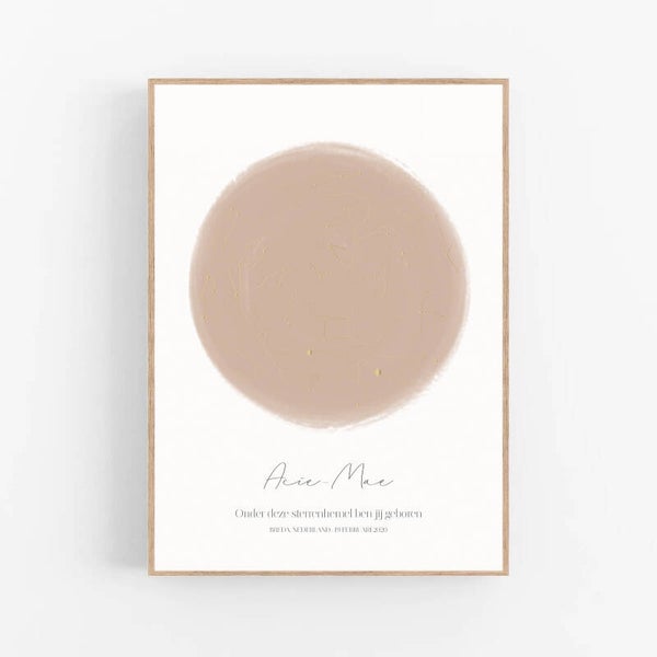Deze waanzinnige sterrenhemel poster heeft een licht roze kleurige cirkel met watercolor effect. De stand van de sterren wordt weergegeven in prachtig foliedruk. Je kunt kiezen uit 4 verschillende kleuren foliedruk; Goud | Zilver | Koper | Brons.
