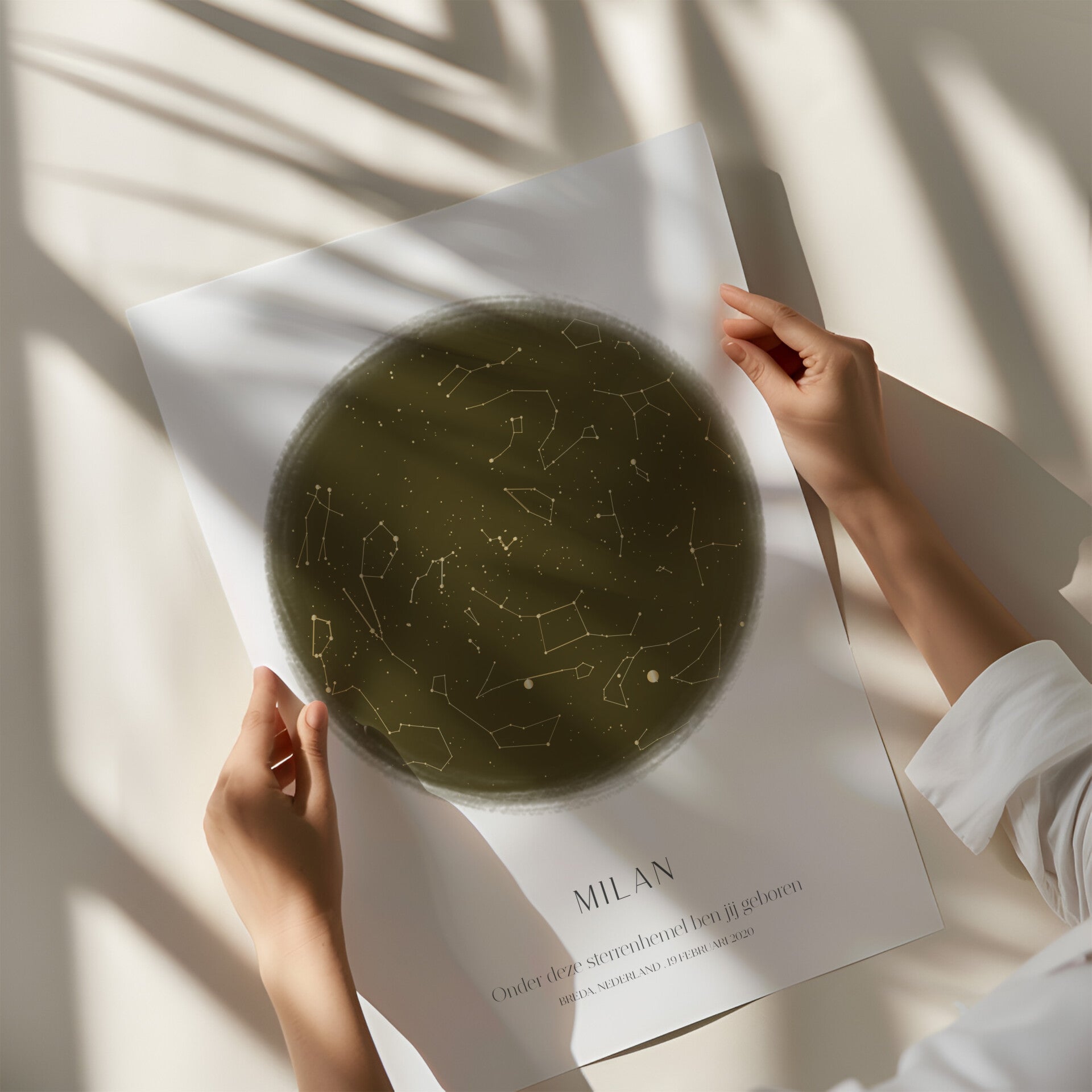 - De persoonlijke gegevens hebben wij nodig om de precieze sterrenhemel te kunnen bepalen. Het is per sterrenhemelposter verschillend wat er in tekst wordt geschreven.