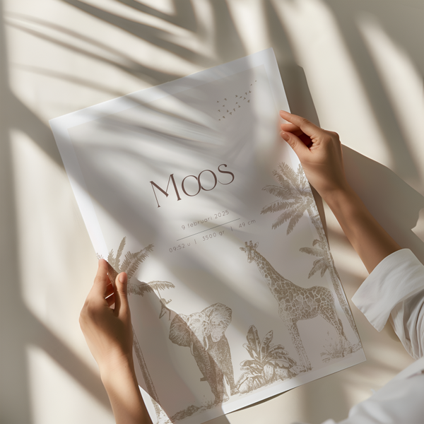 Deze stoere geboorteposter heeft een licht zandkleurige achtergrond en stoere grafische illustraties in een bruintint. Op de poster zie je de giraf, olifant en verschillende aapjes die rondslingeren in de bomen.