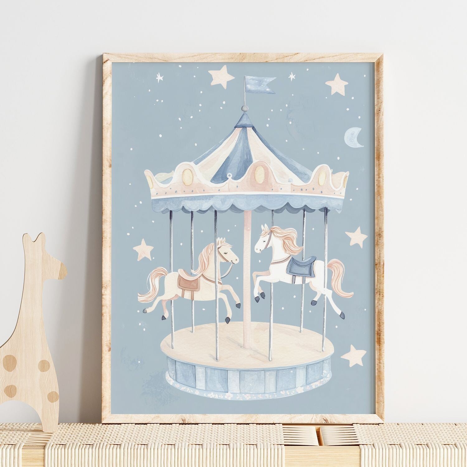 Fleur de baby- of kinderkamer op met deze prachtige illustratie van een blauwe draaimolen.