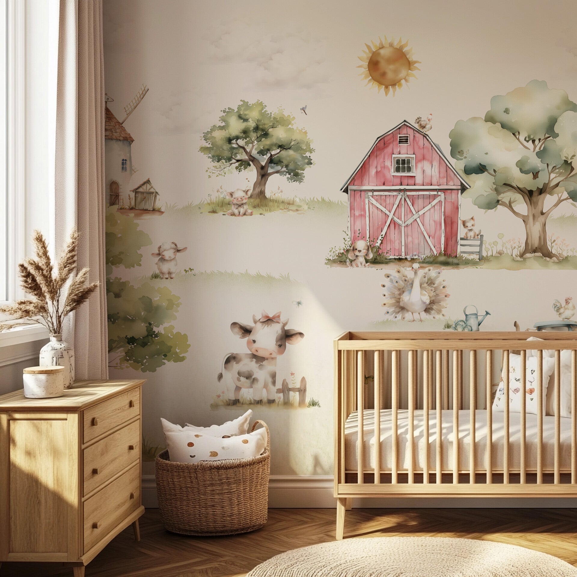 Breng een warme, speelse sfeer in de kinderkamer met dit lieve boerderijbehang! Met zachte aquarelillustraties van een schattige rode schuur, een stoere blauwe tractor en vrolijke boerderijdieren zoals koeien en kipjes, voelt de kamer meteen knus en gezellig aan.