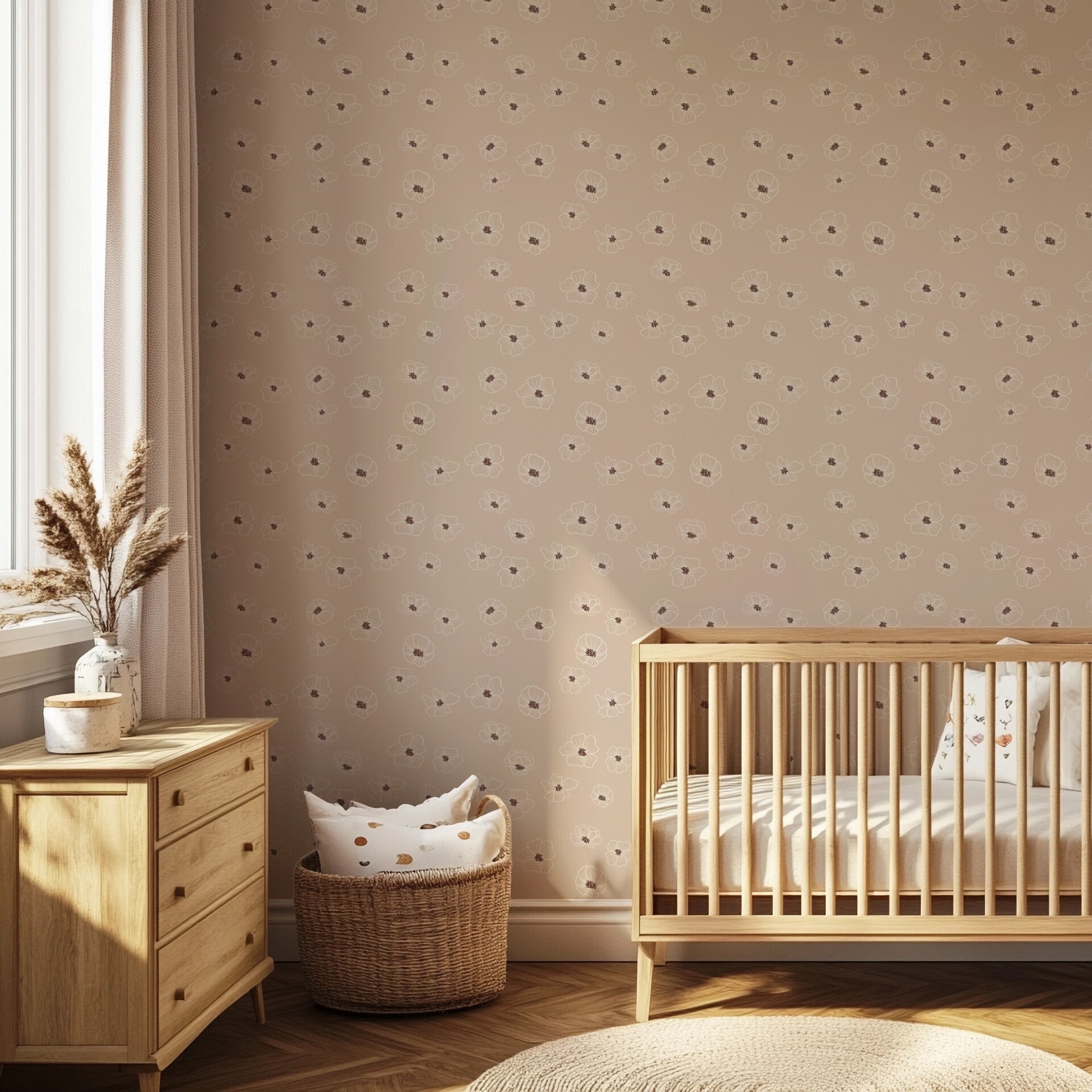Dit vrolijke behang voor de baby- en kinderkamer heeft een mooie beige ondergrond met zachte lichtbeige bloemen en bruine stempels. De kleuren zorgen voor een gezellige en speelse sfeer die perfect is voor kleine dromers en avonturiers!
