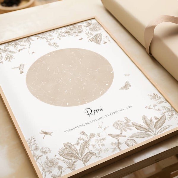 Met de naam van je kindje, de geboortedatum en -locatie wordt het een persoonlijk kunstwerkje dat perfect past in de babykamer of kinderkamer. Het rustige kleurgebruik maken de poster niet alleen mooi om naar te kijken, maar ook een fijne manier om verhalen te vertellen – over sterren, over dromen, en over hoe bijzonder die ene nacht was.