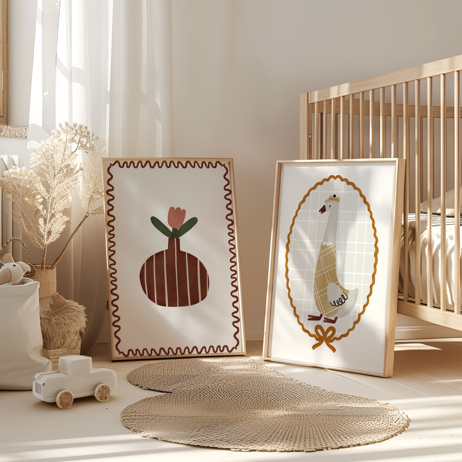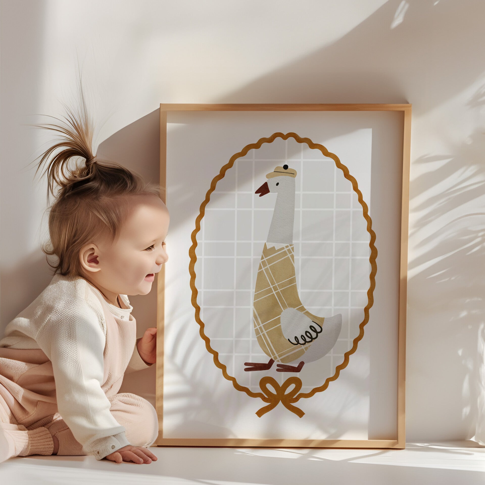 Geef de kinderkamer een stijlvolle en speelse touch met deze prachtige retro kinderkamer poster. De zachte aardetinten en unieke illustratie van een gans zorgen voor een gezellige en warme sfeer in elke ruimte.
