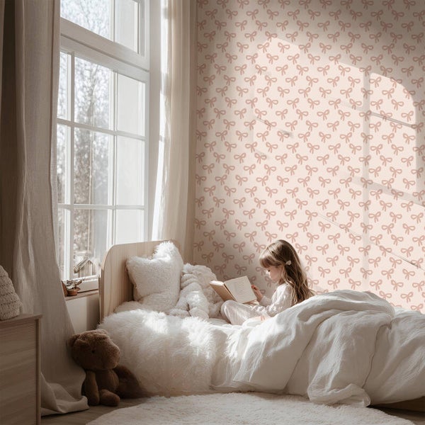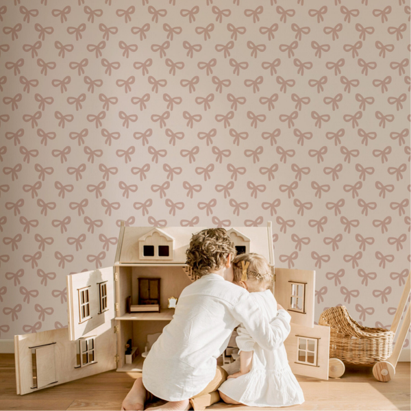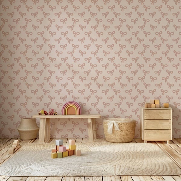 Dit schattige behang voor de baby- en kinderkamer heeft een prachtig patroon van strikjes in een beige tint.