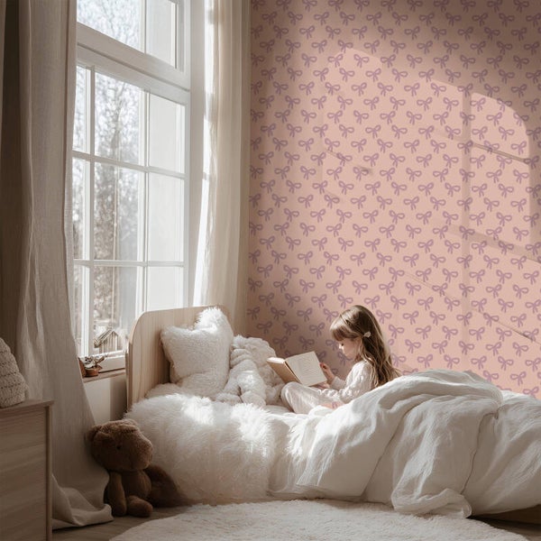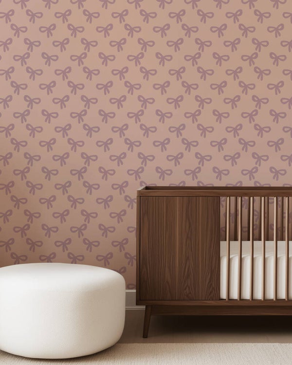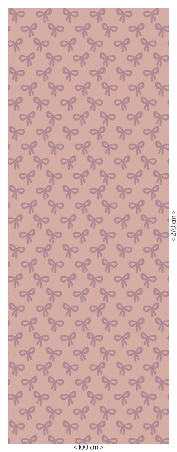 Dit schattige behang voor de baby- en kinderkamer heeft een prachtig patroon van strikjes. Het behang heeft een zacht zalm kleurige ondergrond met paarse strikjes.