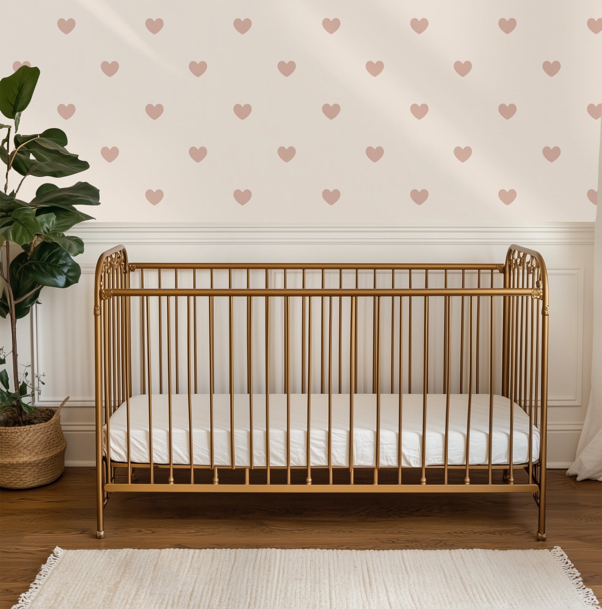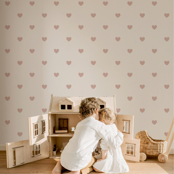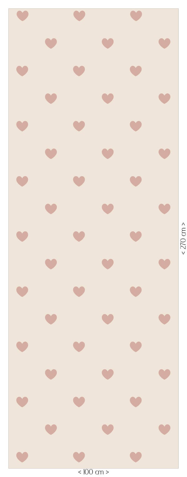 Dit schattige behang voor de baby- en kinderkamer heeft een prachtig patroon van hartjes in een beige tint.