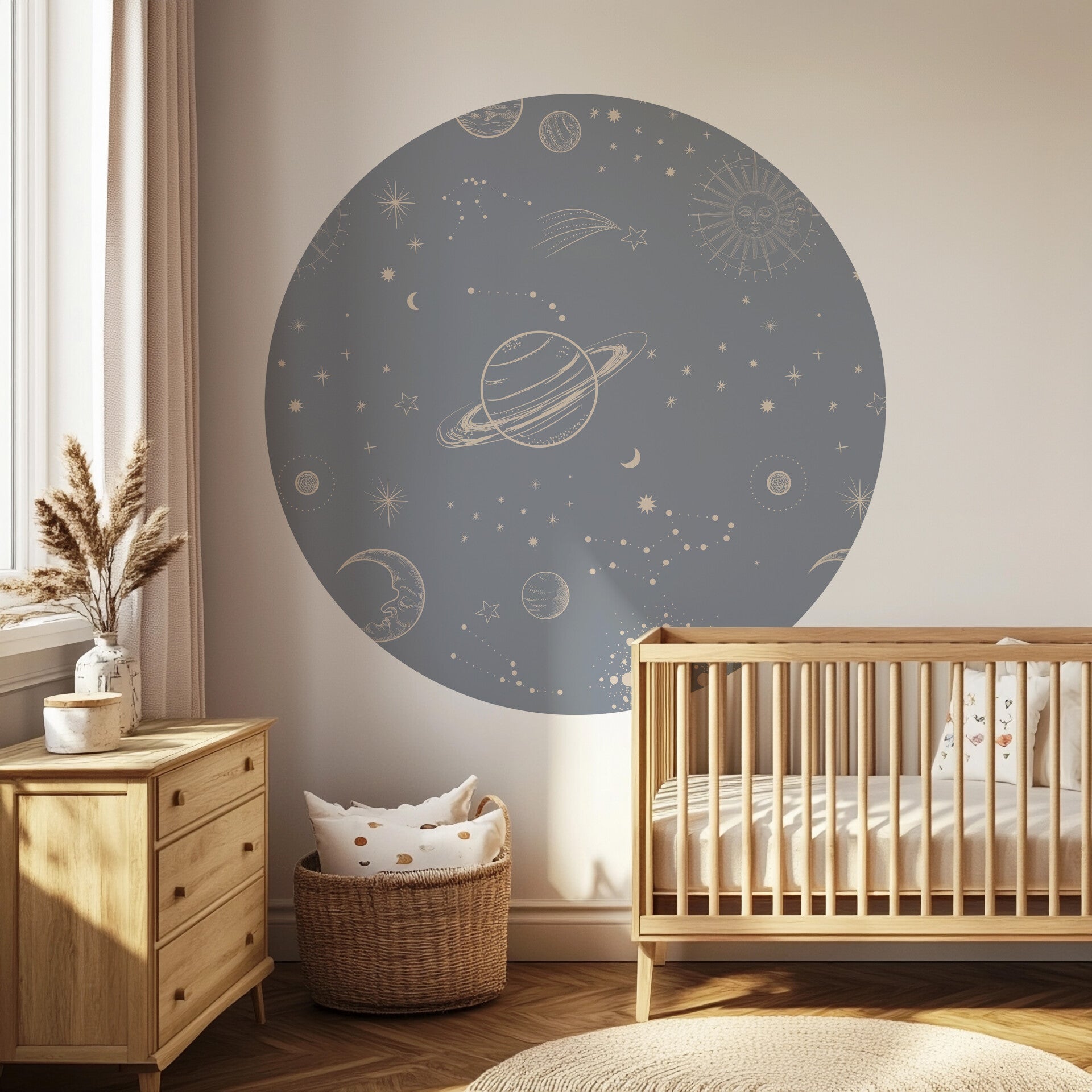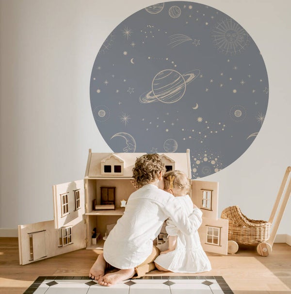 Deze leuke zelfklevende behangcirkel voor de baby- en kinderkamer heeft een stoere denim blauwe ondergrond met een grafische beige print van het heelal! Perfect voor kleine ruimtevaarders die houden van sterren en planeten.