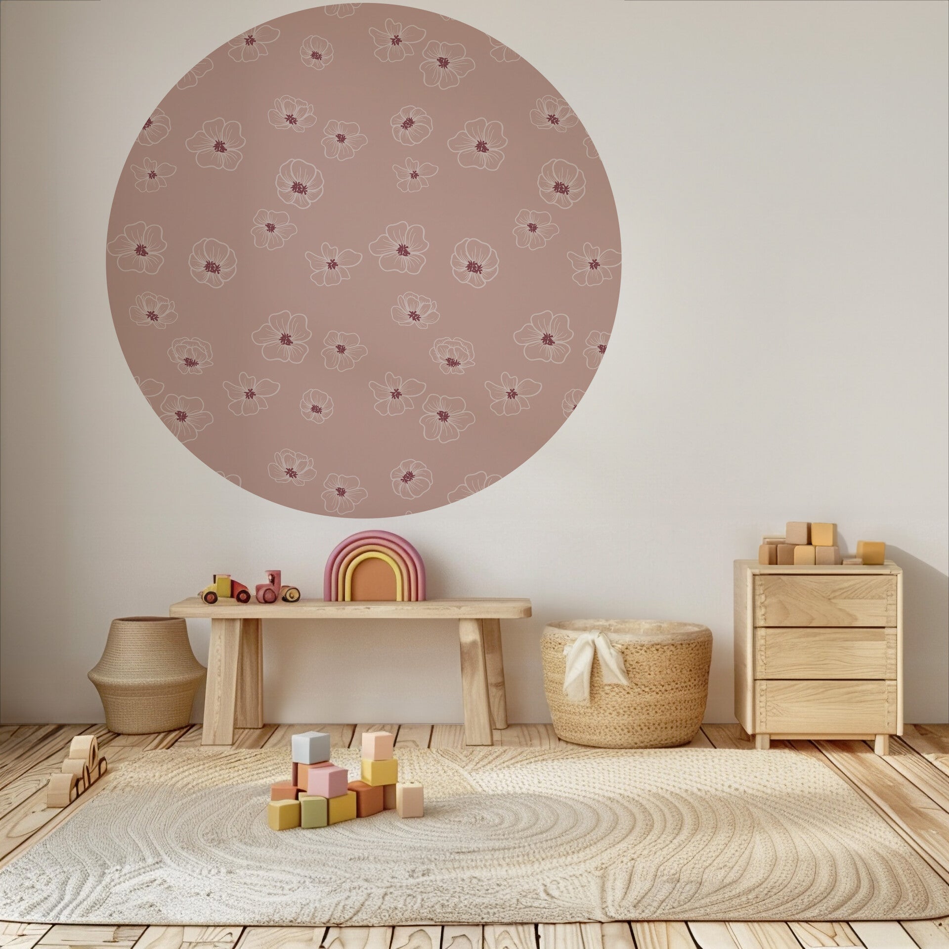 Deze vrolijke behangcirkel voor de baby- en kinderkamer heeft een mooie oudroze ondergrond met zachte lichtbeige bloemen en bordeauxrode stempels. De kleuren zorgen voor een gezellige en speelse sfeer die perfect is voor kleine dromers en avonturiers!