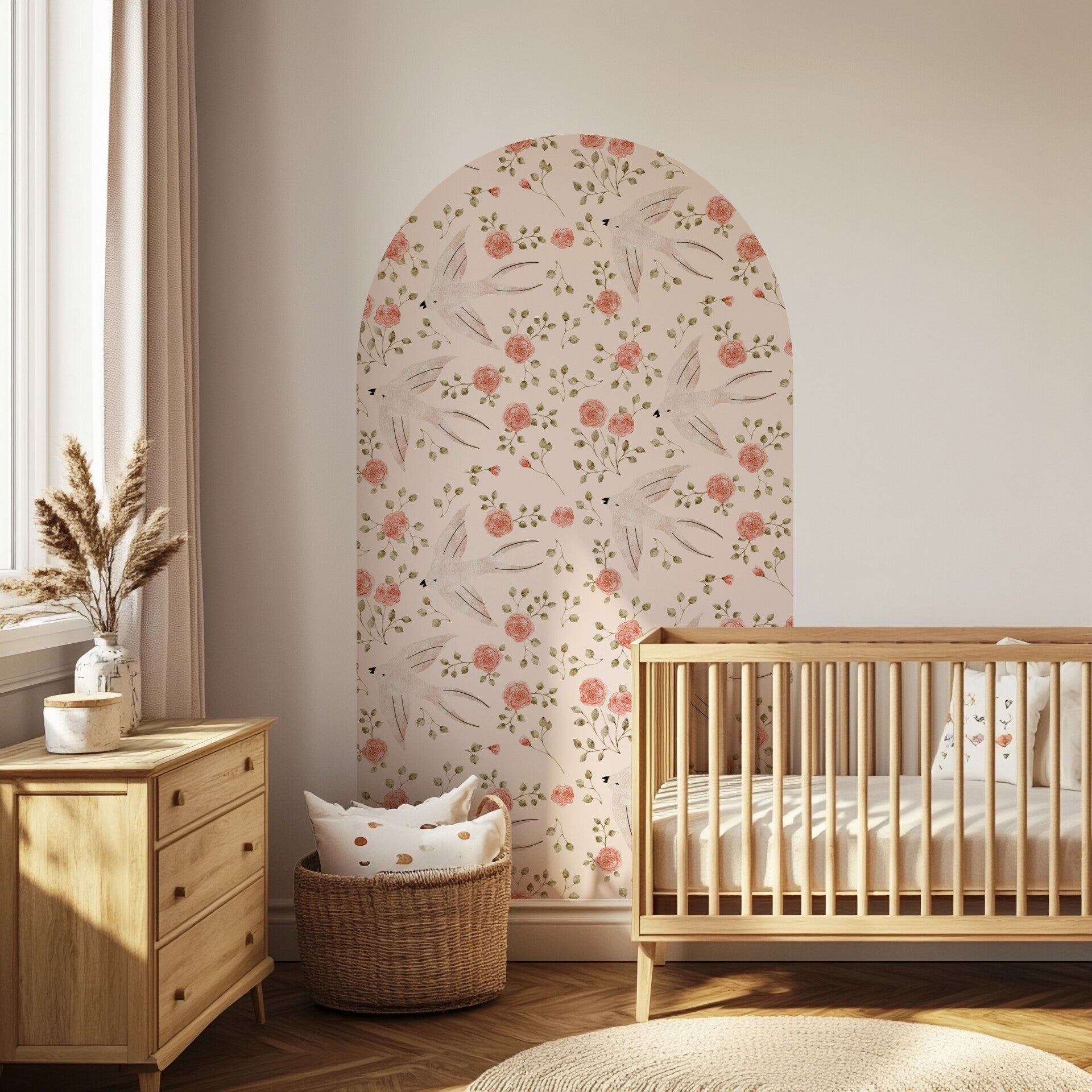 Geef de kinderkamer een speelse en stijlvolle touch met deze zelfklevende behangboog! De betoverende print vol sierlijke zwaluwen en zachte rozen in warme, rustige tinten geeft de kinderkamer een knusse en dromerige sfeer.