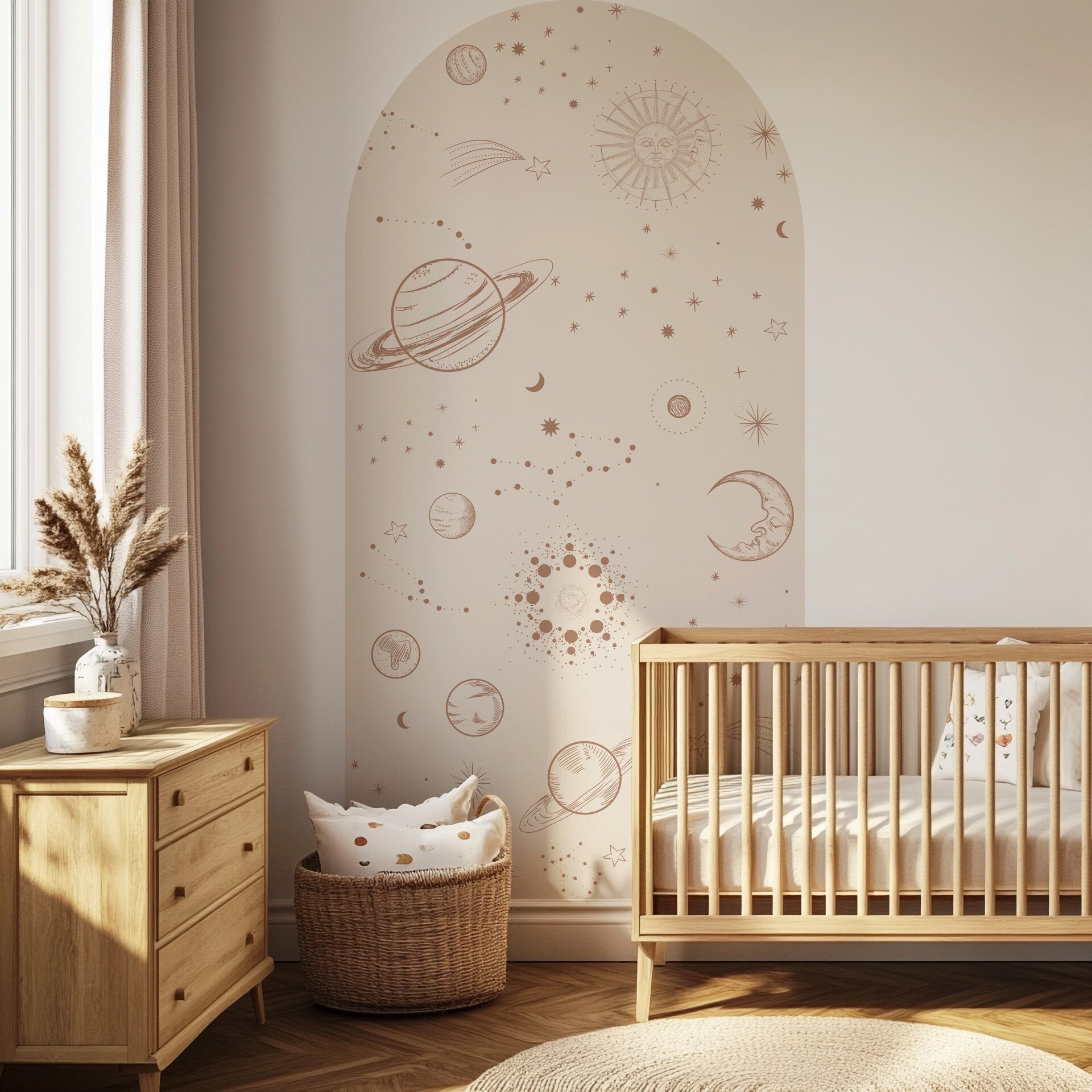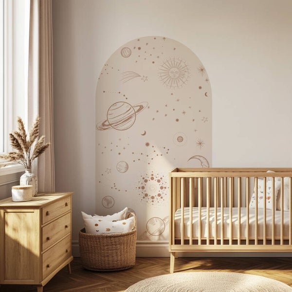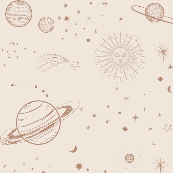Met een beige ondergrond en een warm bruine grafische print van sterren en planeten brengt de behangboog het heelal naar de kinderkamer. Perfect voor kleine avonturiers die graag dromend naar de sterren kijken!