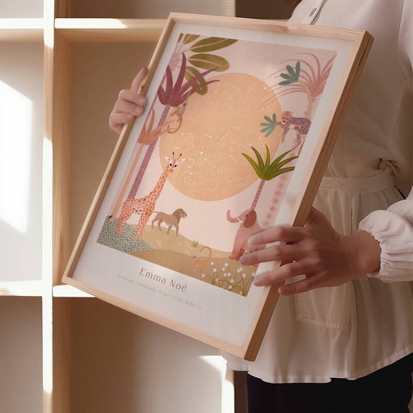 De speelse giraf, ondeugende apen en knuffelige olifant waken over de geboortedag, terwijl de zachtroze tinten zorgen voor een kalme, liefdevolle sfeer in de kamer. Deze persoonlijke poster is niet alleen een prachtig aandenken, maar ook een poëtisch kunstwerkje voor aan de muur.