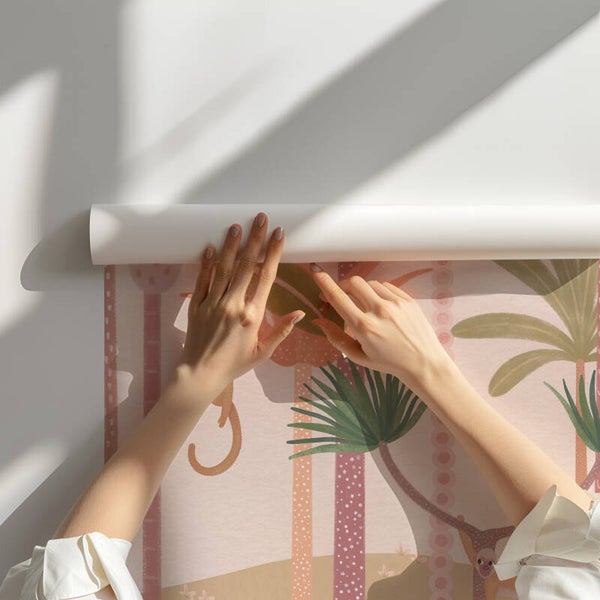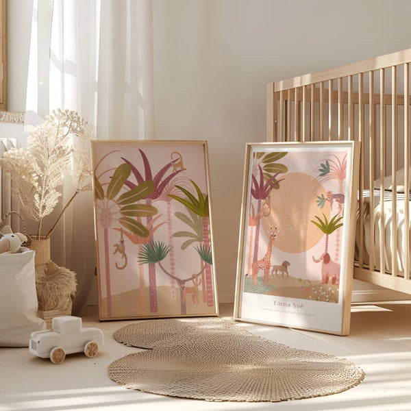 Vrolijke aapjes slingeren door de palmbomen in deze lieve jungleposter vol zachte kleuren en tropische sfeer. Perfect voor meisjes die van dieren en avontuur houden!
