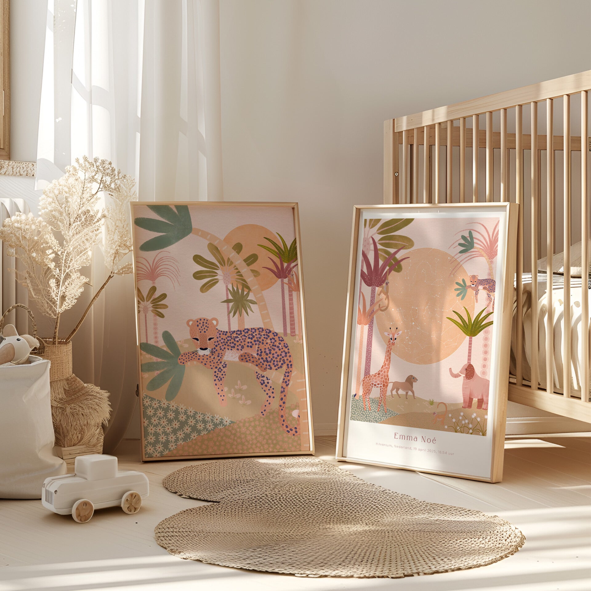 Een sierlijke luipaard rust hoog bovenin de boom omringd door palmen in poederroze, perzik en zachtgroen. De poster heeft een sprookjesachtige achtergrond die perfect past in een stijlvolle, avontuurlijke meisjeskamer.