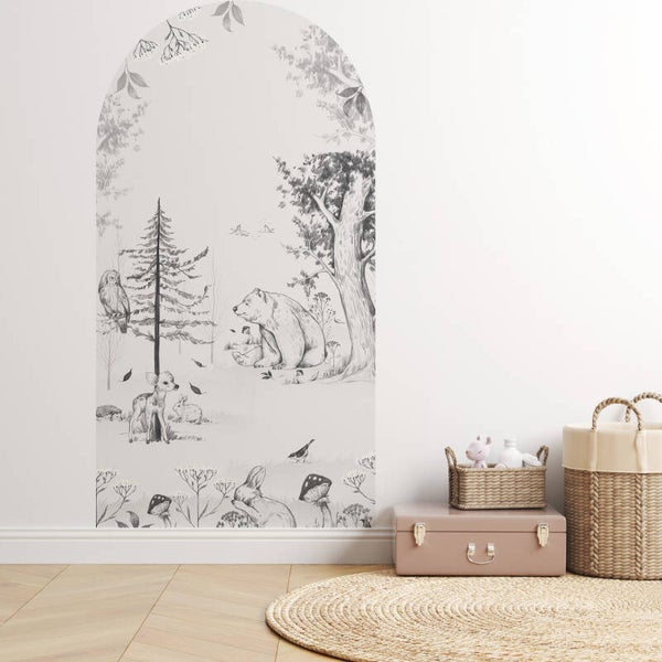 Geef de kinderkamer een speelse en stijlvolle touch met deze zelfklevende behangboog met prachtig bosdieren thema.