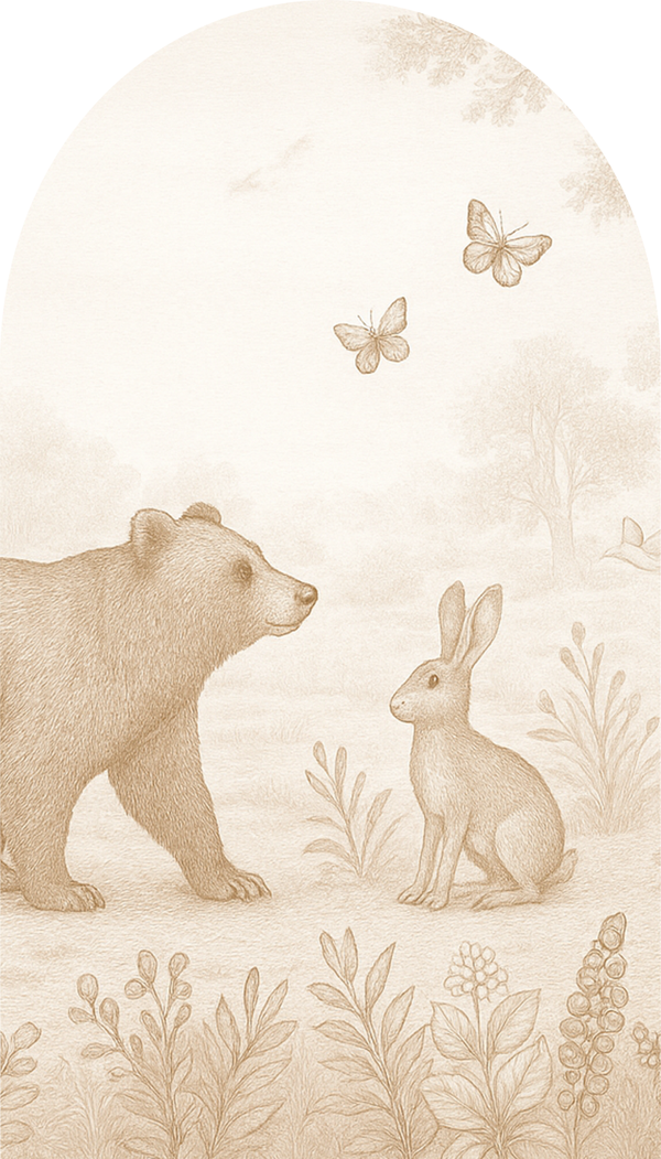 Zacht afgerond aan de bovenkant, vol lieve details van bosdieren, bloemen en vlinders vanbinnen. Deze behangboog brengt rust en karakter in de kinderkamer zonder te overheersen.