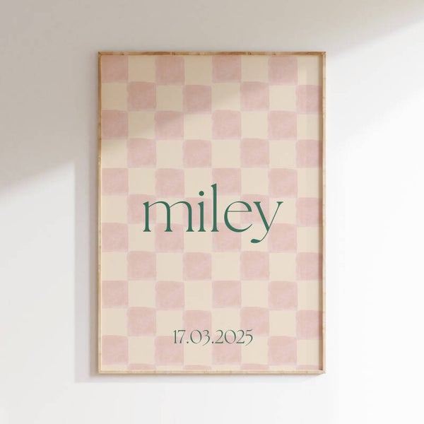 Op zoek naar een originele blikvanger voor de kinderkamer? Onze trendy naamposters met retro ruitjespatroon zijn de perfecte mix van nostalgie en modern design. Elke poster is voorzien van een zachte, handgeschilderde ruitjesprint in warme, rustige tinten – ideaal voor een stijlvolle kinderkamer of speelhoek.