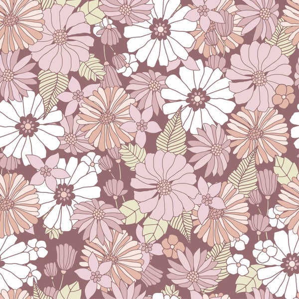 Breng warmte, kleur en karakter in de kinderkamer met dit prachtige retro bloemen behang in lila tinten. De speelse mix van zachte roze, lila en crèmekleurige bloemen zorgt voor een vrolijke én rustgevende sfeer, perfect voor de kleintjes om in weg te dromen.