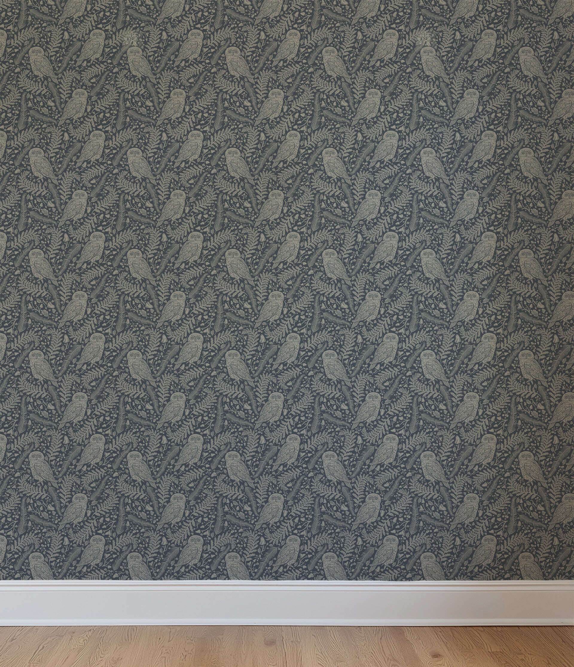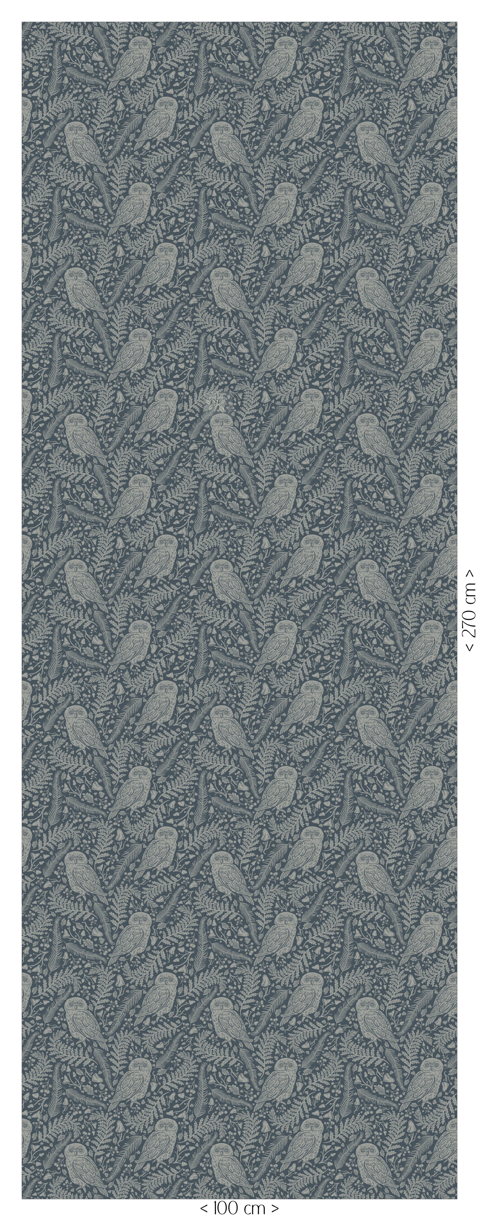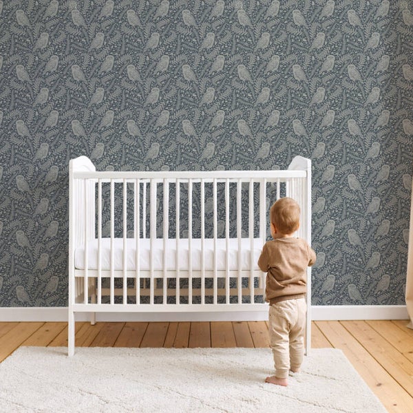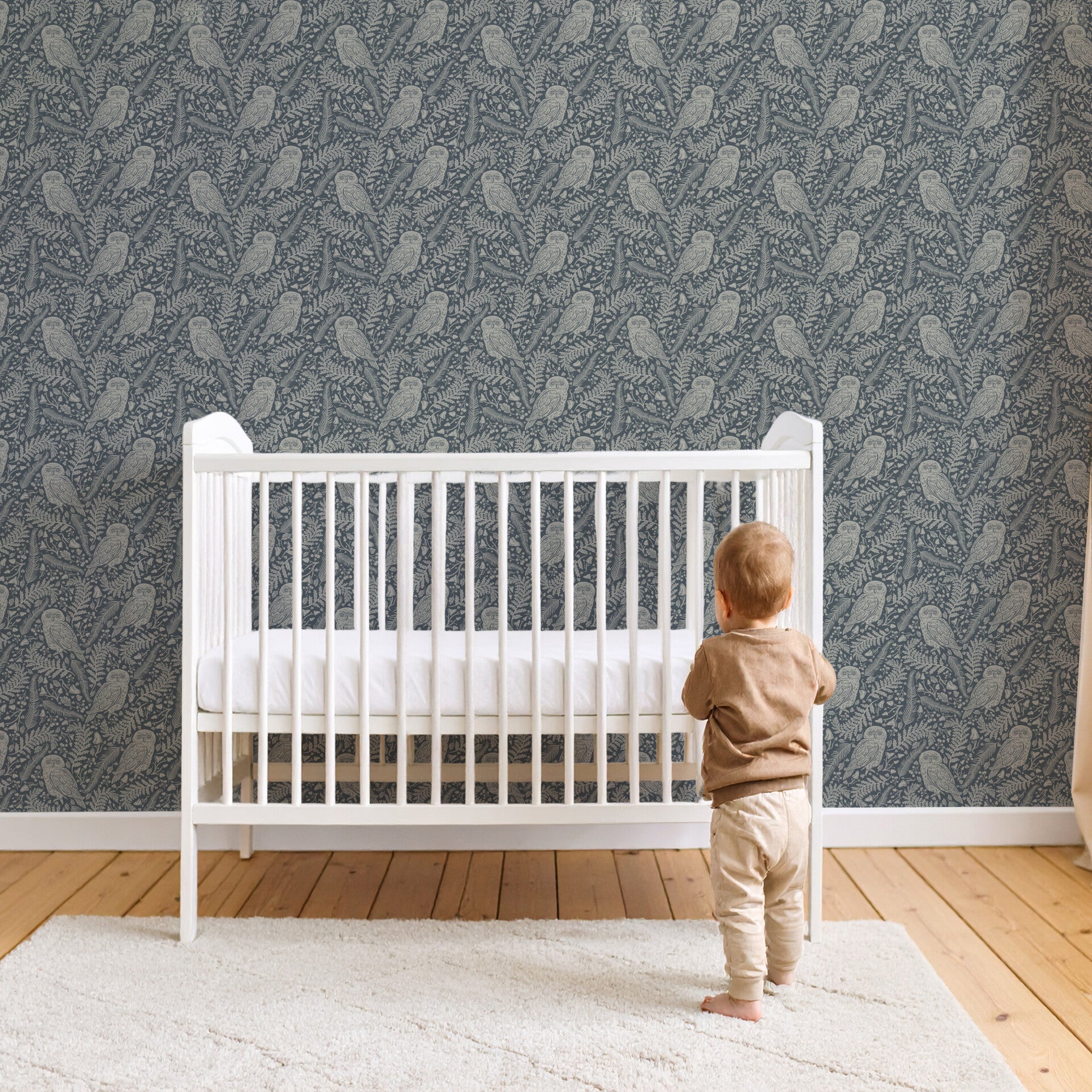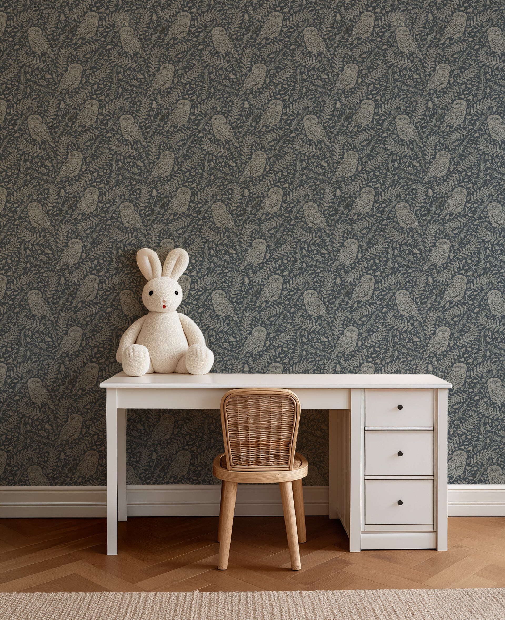 Tover de kinderkamer om tot een betoverend bos met dit prachtige bosdieren behang met uiltjes in donkerblauw. Het gedetailleerde patroon van rustende uilen tussen bladeren en takken geeft een rustige, dromerige sfeer aan elke ruimte.