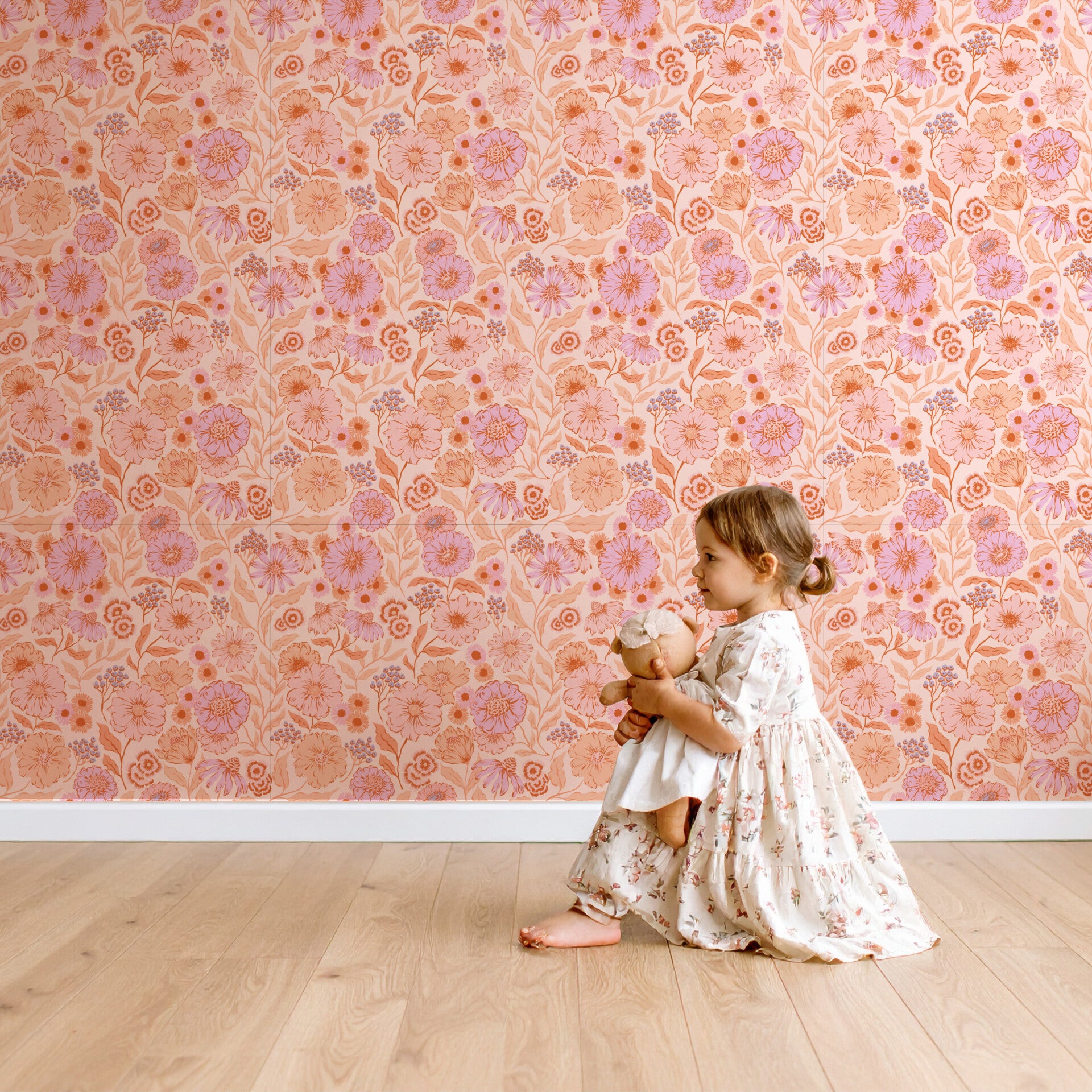 Stap binnen in een zomers bloemenveld, een speels en kleurrijk behang vol bloeiende fantasie. De combinatie van zachte roze, perziktinten en warme oranje accenten zorgt voor een vrolijke en dromerige sfeer – perfect voor de kinderkamer of babykamer.