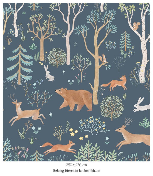 Dieren in het bos | blauw is een echte blikvanger die rust brengt zonder saai te zijn. Een prachtig behang voor kinderen die houden van dieren, verhalen en het bos – en voor ouders die een uniek, stijlvol statement willen maken in de kinderkamer.