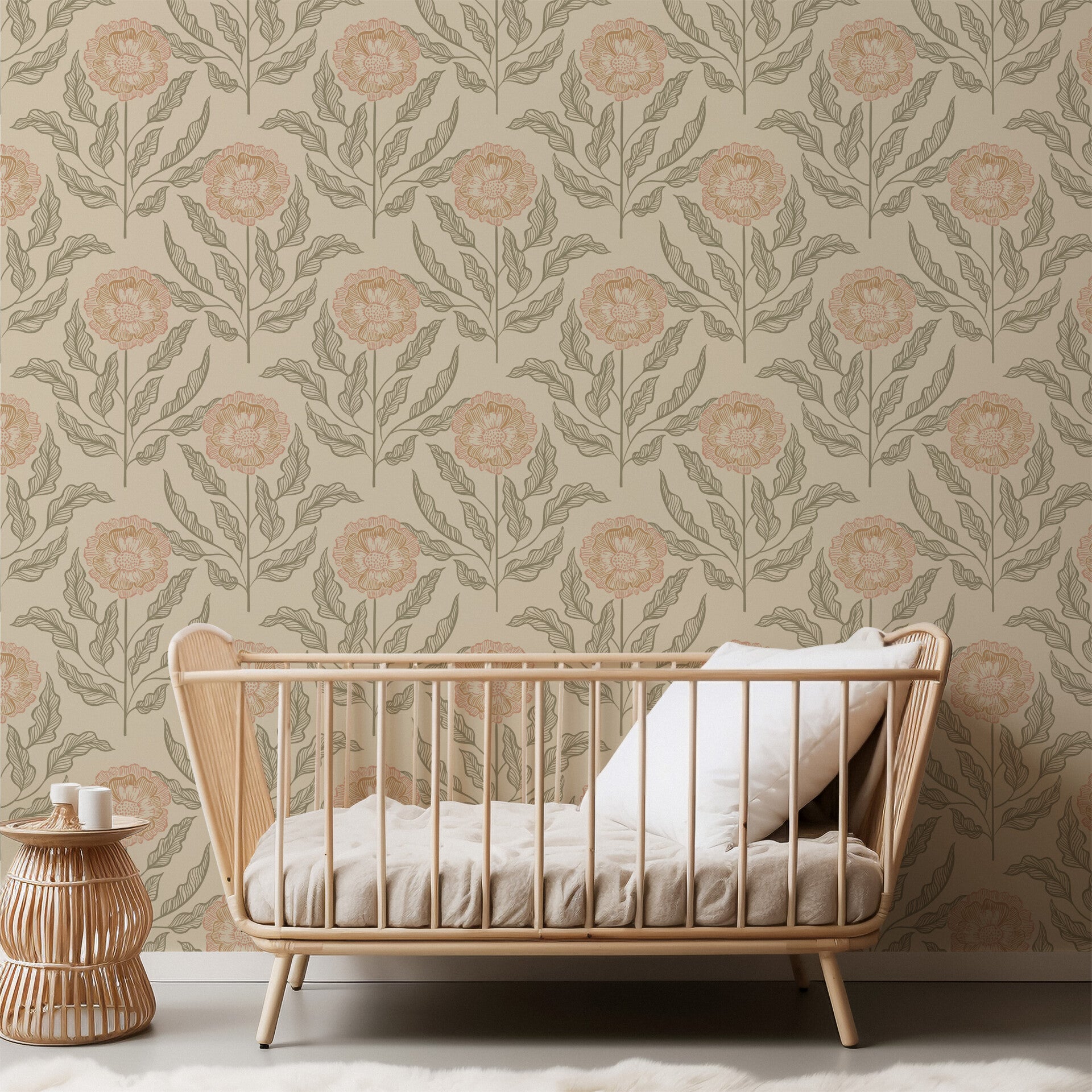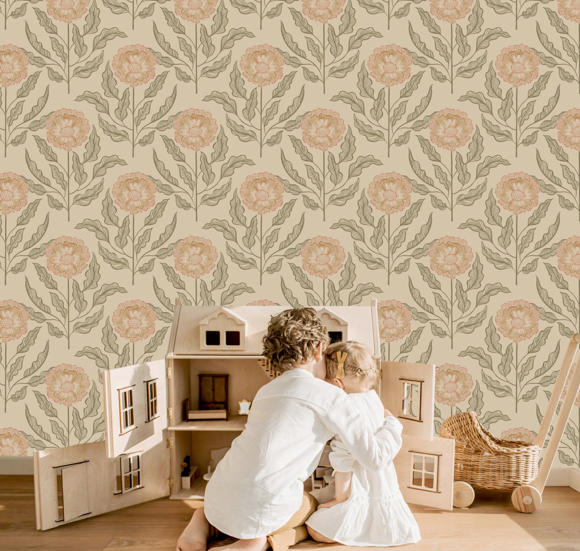 Laat het zonlicht binnendruppelen met Sunset Flowers in Honey Dust. Deze zachte bloemenprint straalt een warme, honingkleurige rust uit, perfect voor een knusse babykamer of een peuterkamer vol dagdromen. De handgetekende bloemen in zachte amber- en zandtinten lijken wel geplukt uit een zomerse veldbloementuin, waar elk blaadje fluistert van natuur en nostalgie.