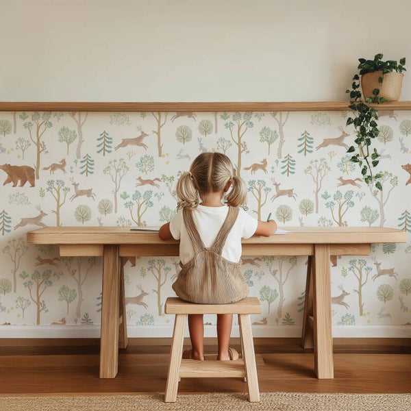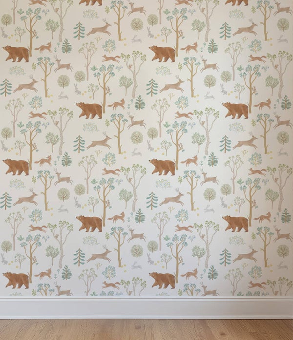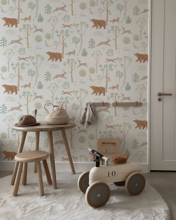 Hertjes, beren, konijnen en bomen vormen samen een herhalend patroon dat zowel rustgevend als vrolijk is. Door de zachte tinten is dit behang perfect te combineren met neutrale meubels, pastelkleurige accessoires en natuurlijke materialen zoals hout en linnen.