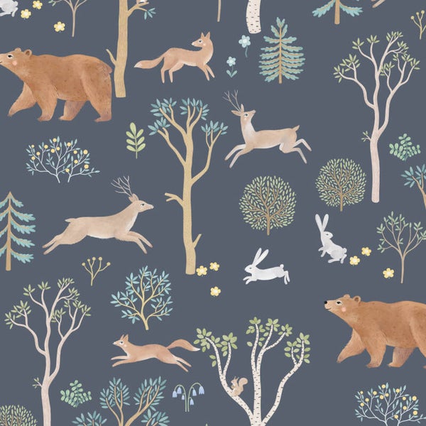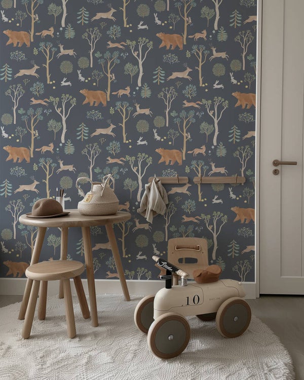 Bosvriendjes – Patroonbehang in Nachtblauw voor de Kinderkamer