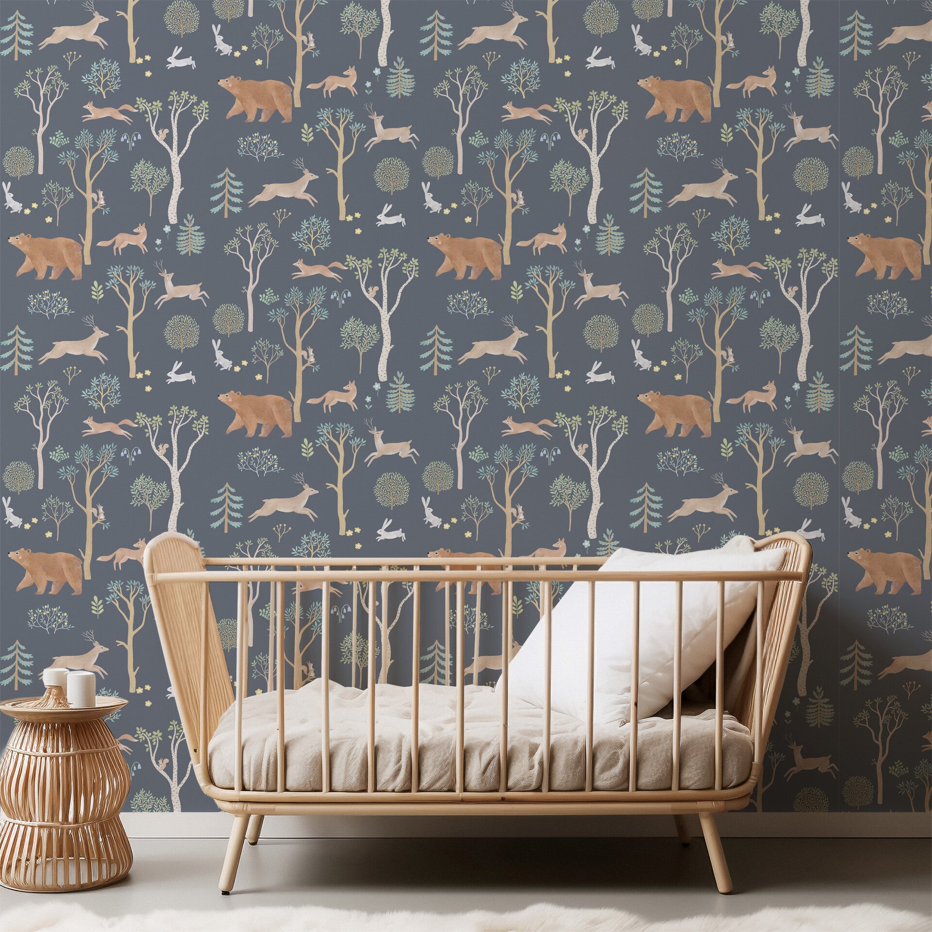 Breng de magie van het bos tot leven met Bosvriendjes – een sfeervol kinderbehang met speelse bosdieren in een herhalend patroon. Deze nachtblauwe variant is perfect voor een knusse babykamer of avontuurlijke peuterkamer. Denk aan nieuwsgierige beren, vrolijke konijnen en springende hertjes tussen sierlijke bomen, allemaal handgetekend in warme aquarelstijl.